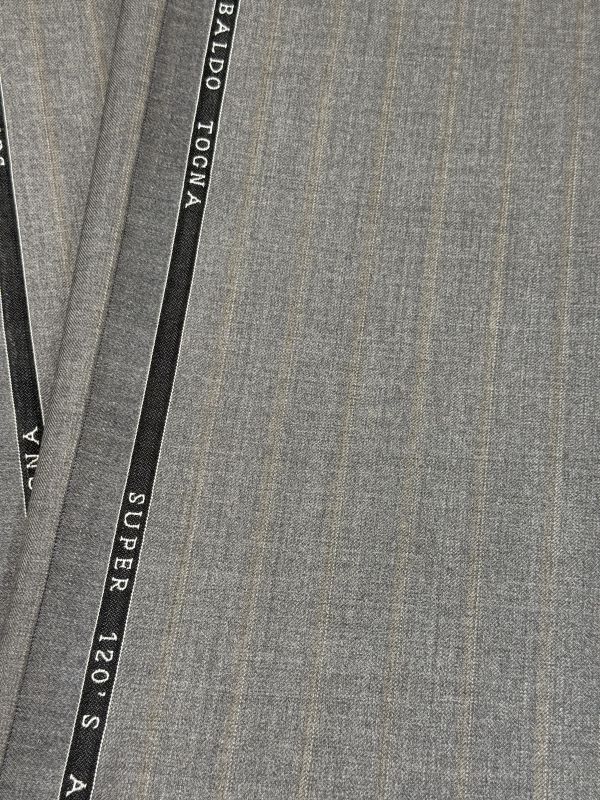 ライトグレーをベースに、オレンジのストライプ、ホワイトのペンシルストライプが重なります。