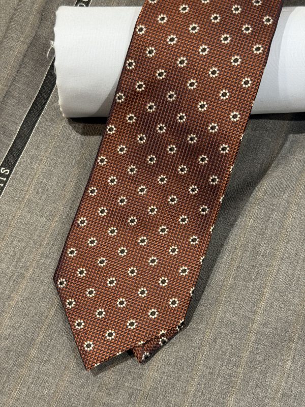サックスブルーのシャツにオレンジ系のネクタイを合わせれば、生地の色味を程よく拾い、渋さと軽快さを併せ持つちょうど良い塩梅のコーディネートが完成します。