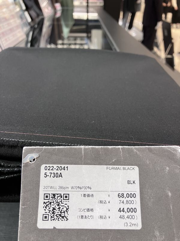 手前がフォーマル向けのブラックの生地で、奥がビジネスシーンを想定したブラックの生地です。