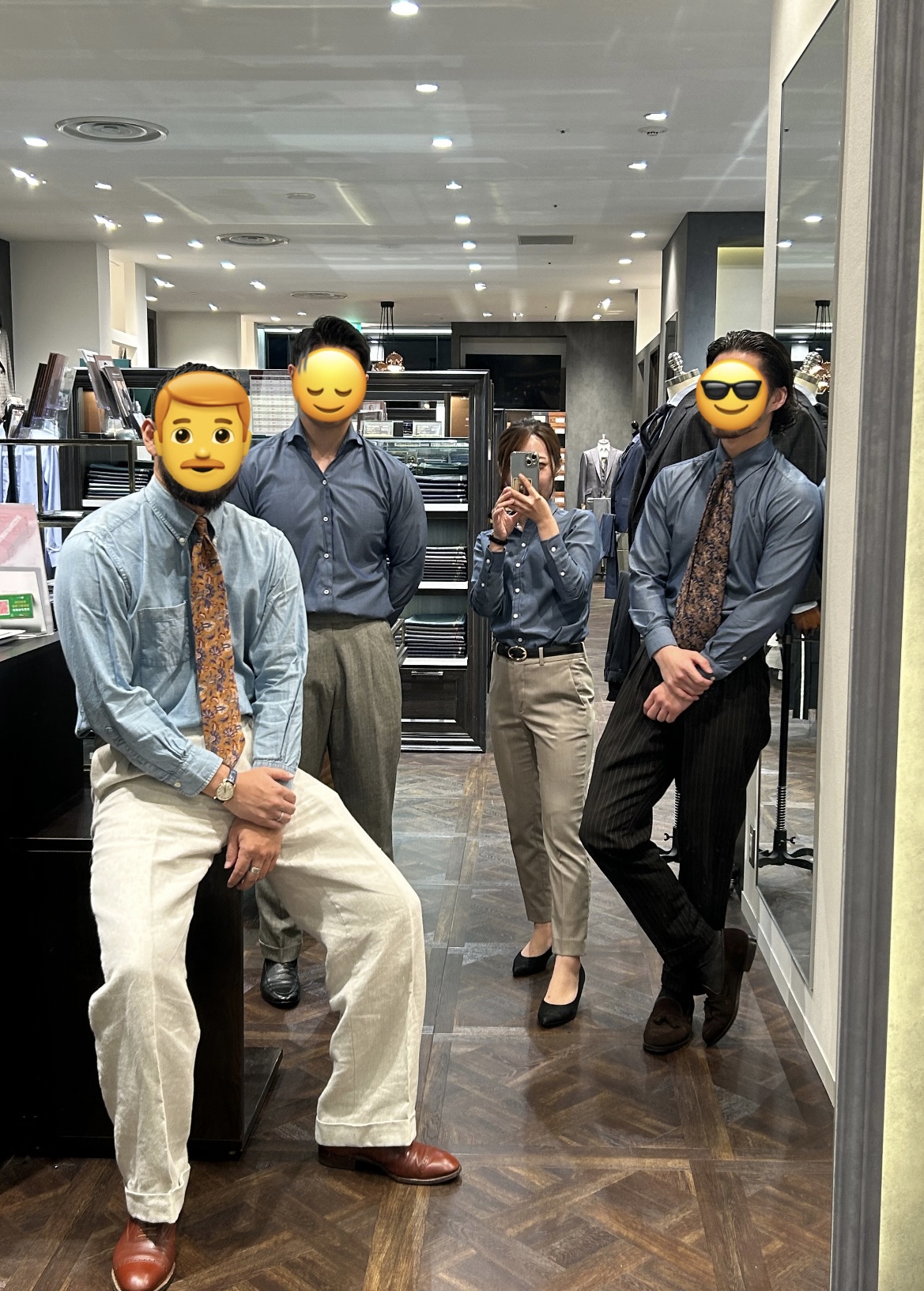 実は丸の内本店の木ノ下さんと田口さんも同じ生地のシャツを持っていらっしゃったので、みんなで写真を撮りました!