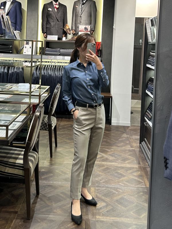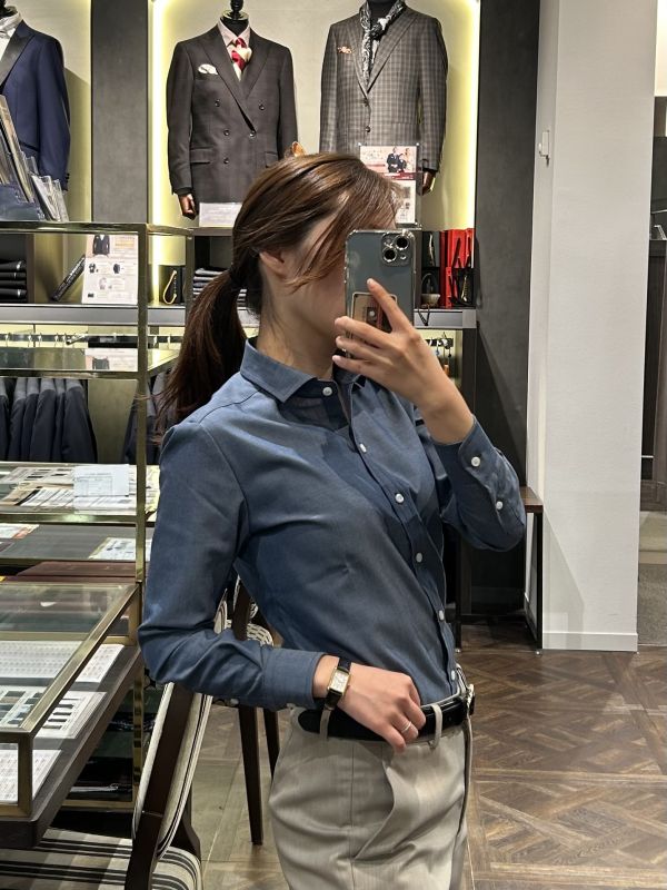 他にも衿はセミワイドで小さめ、小丸のカフスに表前立てなど、カジュアルな要素を詰め込みました!