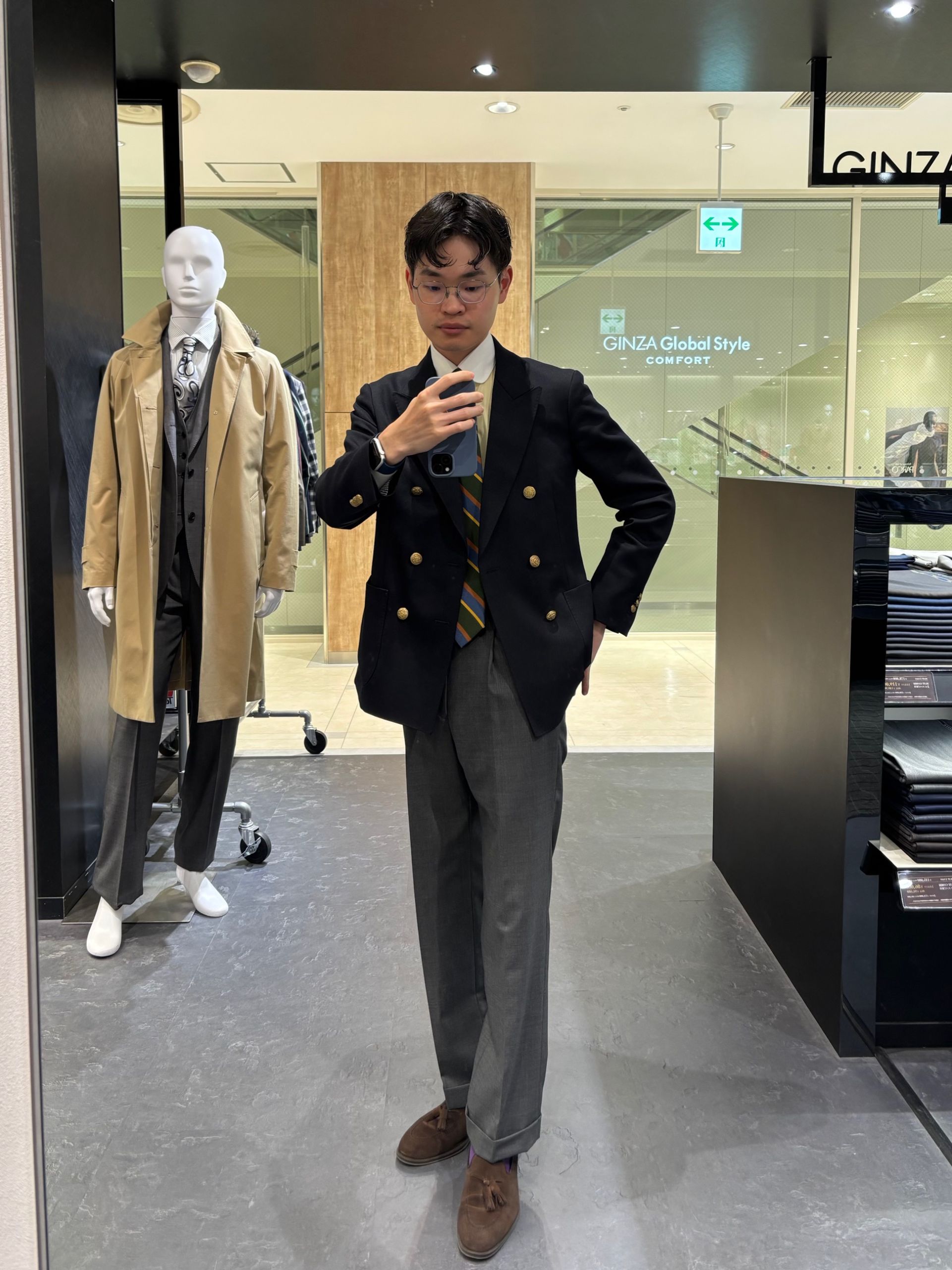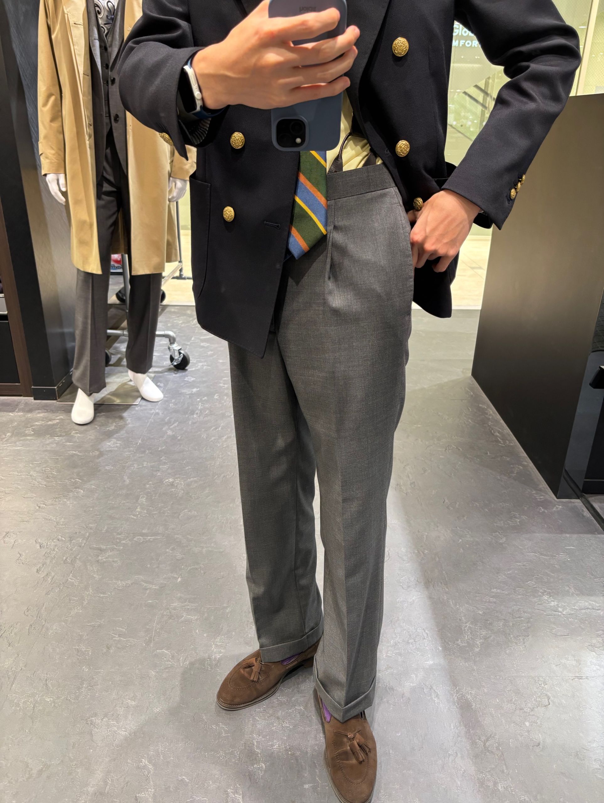 本日のブログは、個人的に久しぶりに組み合わせた紺ブレにグレーのスラックスが良かったので