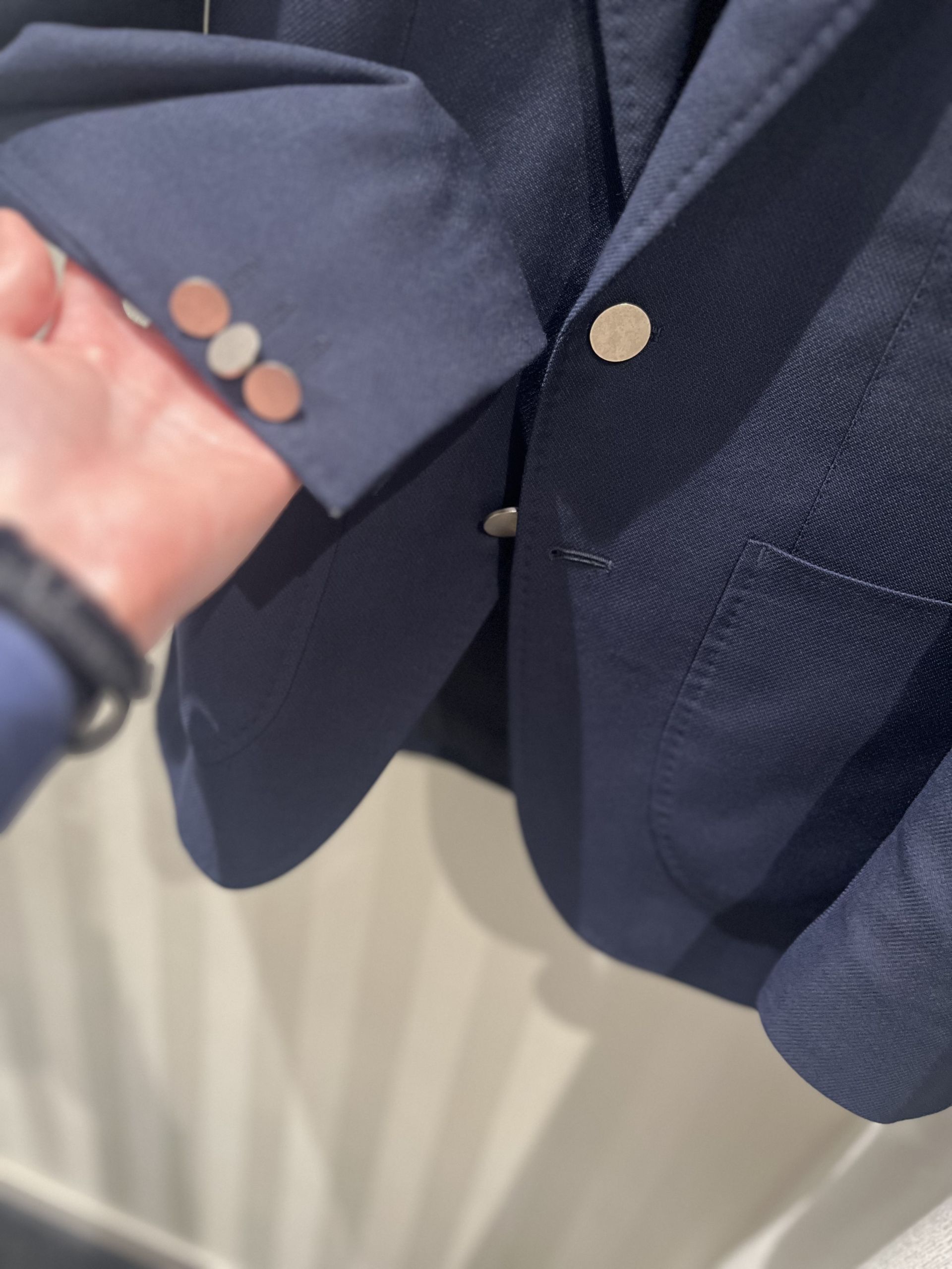 基本的にオフィシャルな場面を想定してスーツの釦は艶消しのスタンダードな釦を使用することが多いですが、紺ブレに関しては金釦や銀釦を付けることで、よりジャケット感が出てきます。