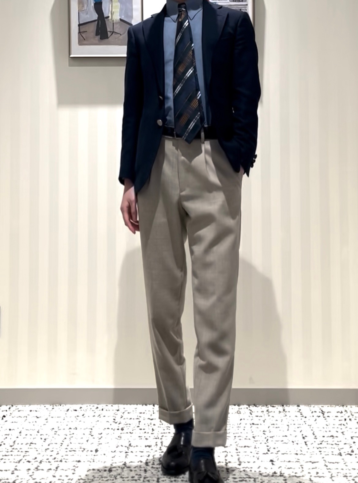 私自身夏場はこのようにベージュのスラックスと合わせていたのですが、