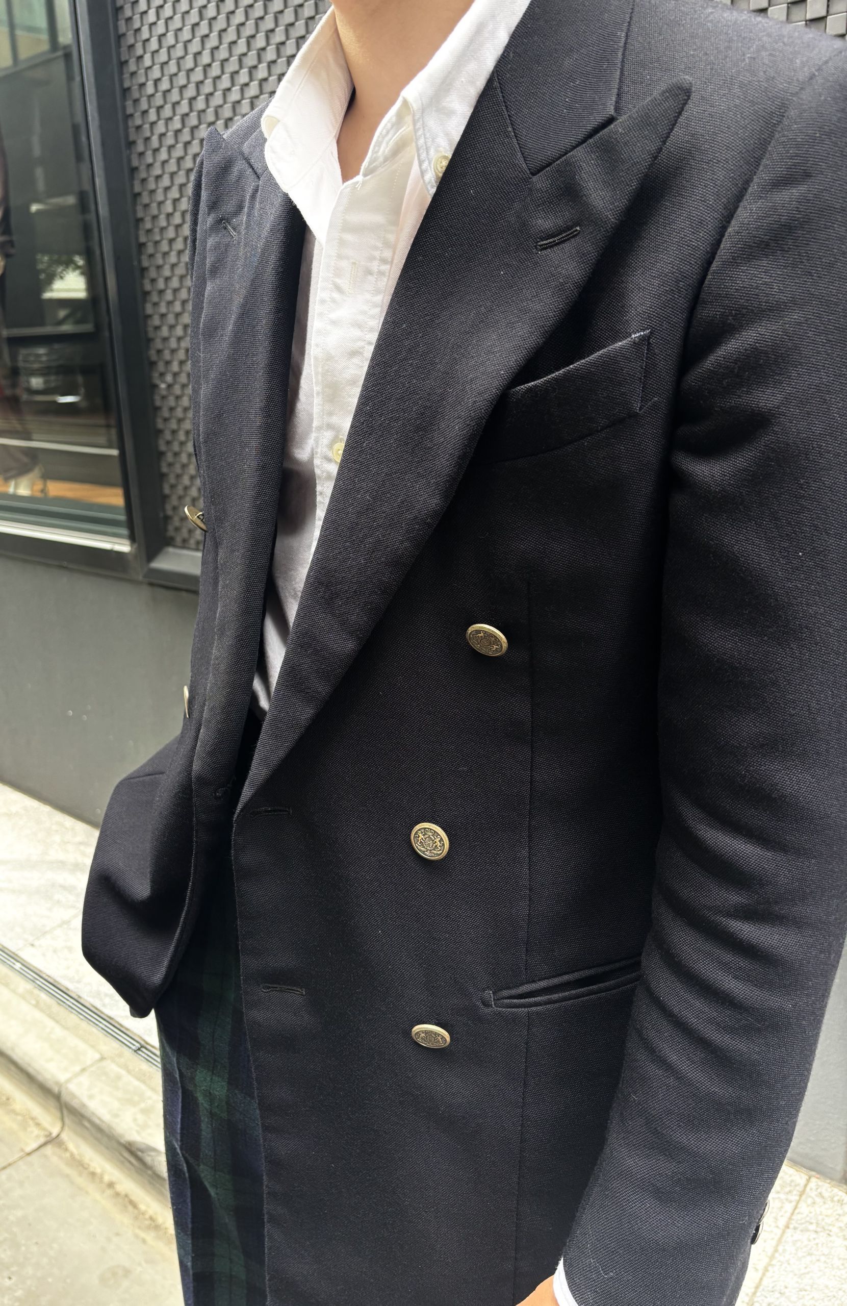 ジャケットにはプレッピーやアイビースタイルに欠かせない紺ブレをあえて銀ボタンで少しブリティッシュテイストにしてあげることで、