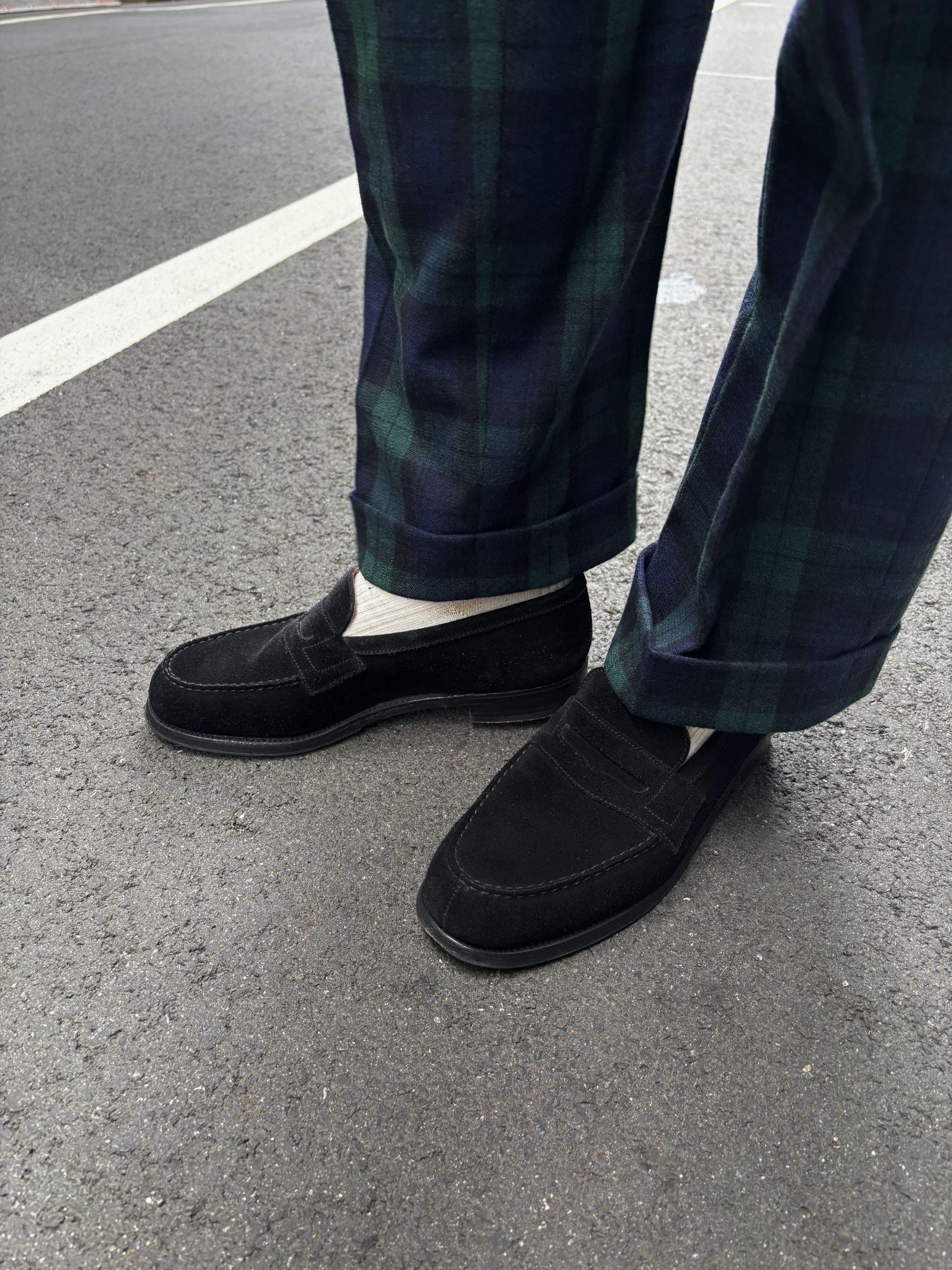 足元は、フレンチの代名詞J.M.Westonのブラックスエードの180シグニチャーローファーです。