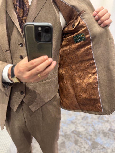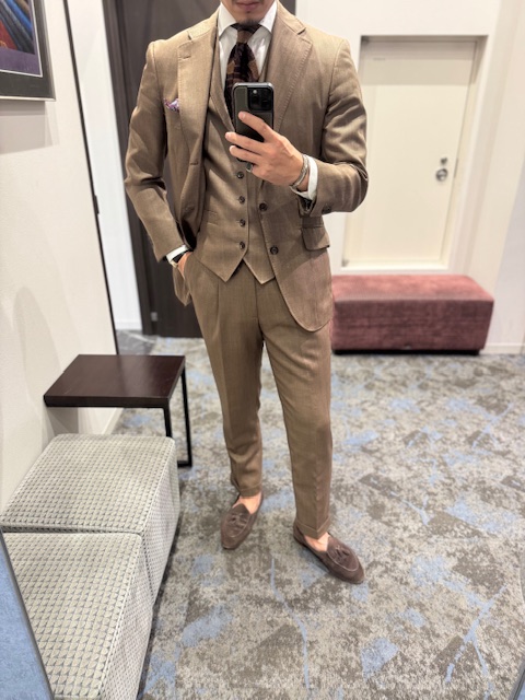 明るめなブラウンのスリーピーススーツです。