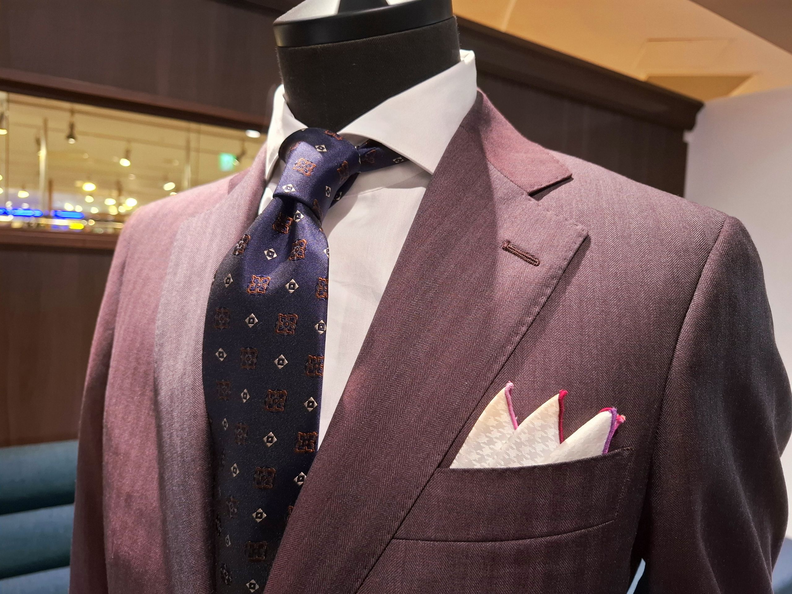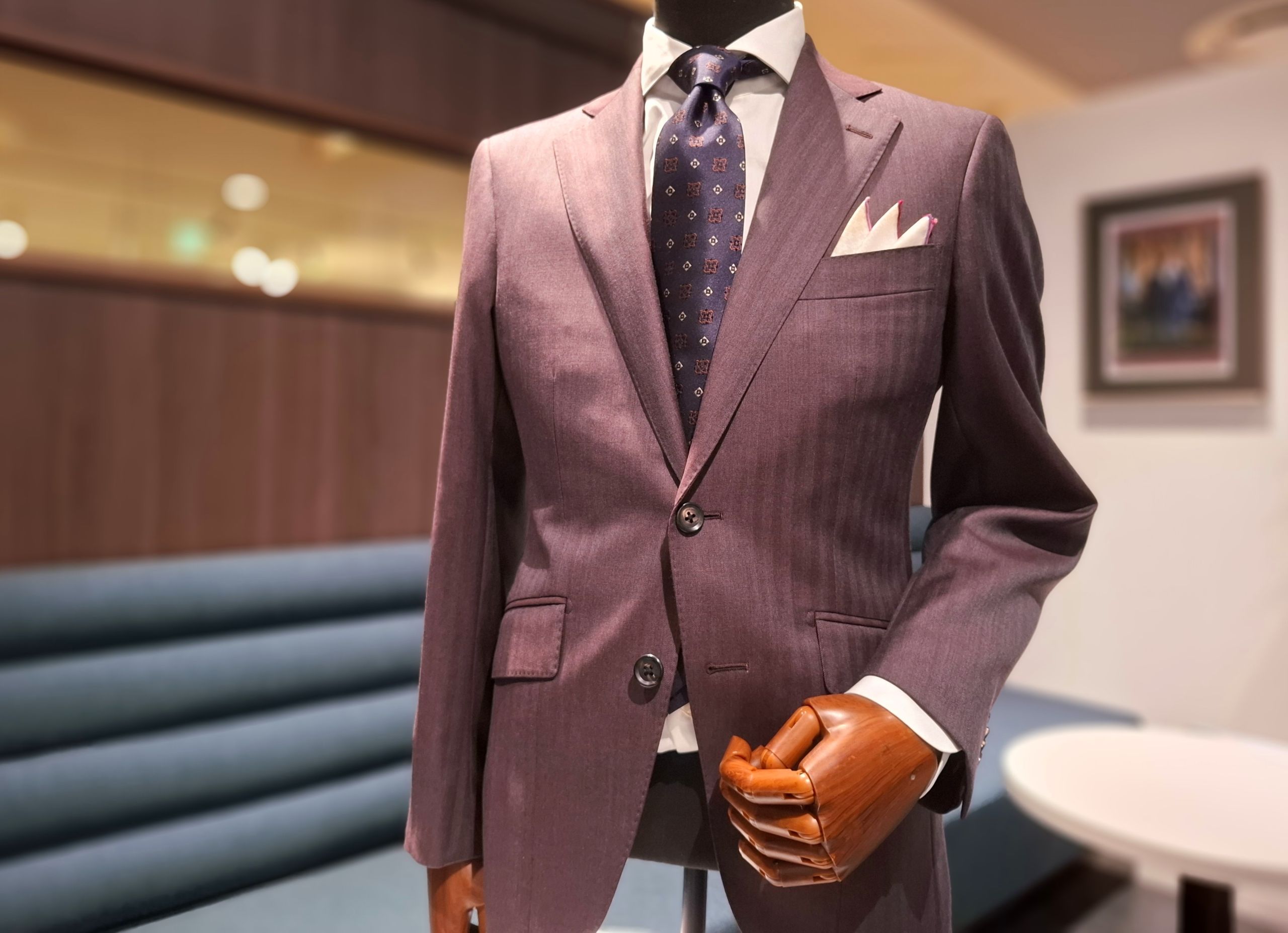写真のスーツは、パープルブラウン系のヘリンボーン柄です。