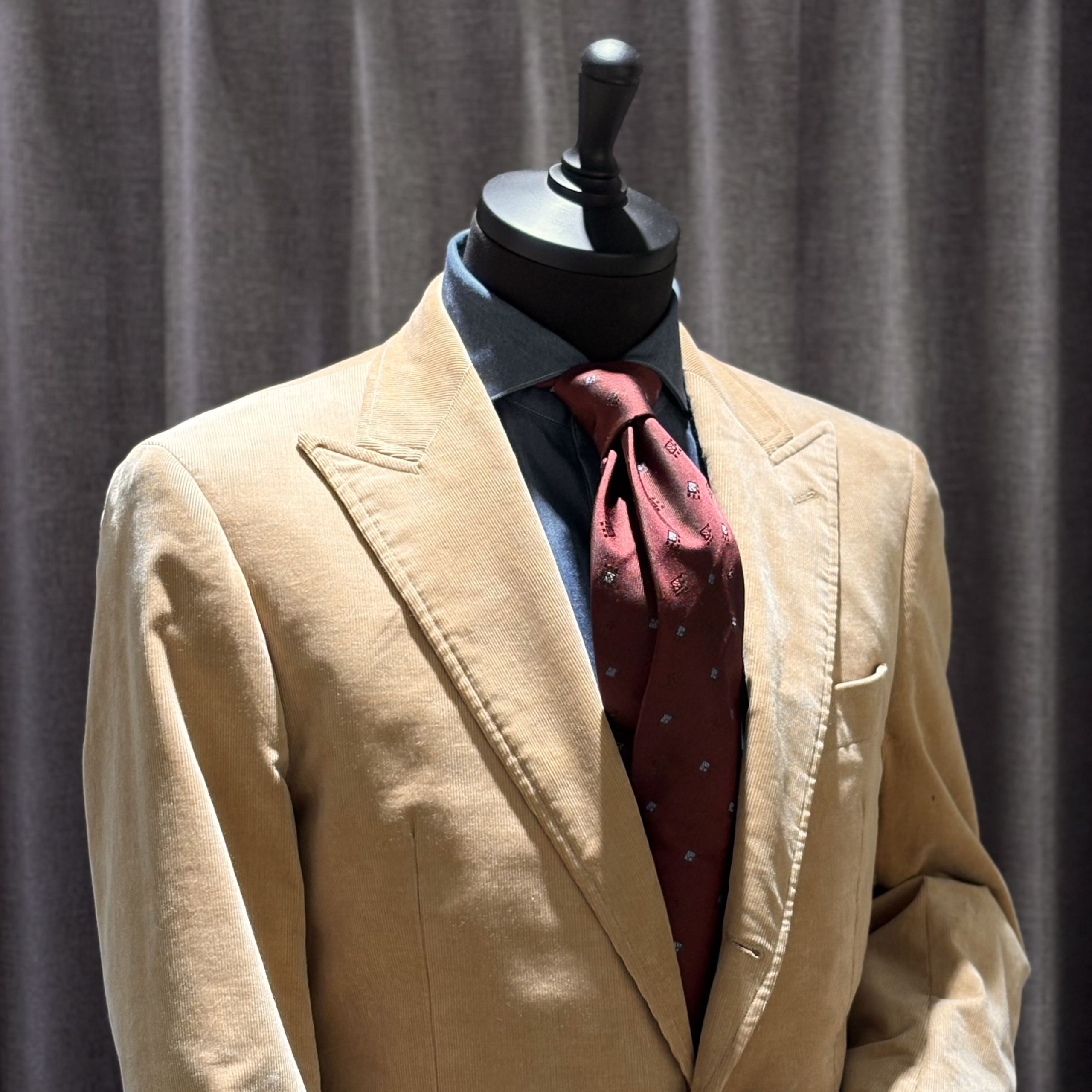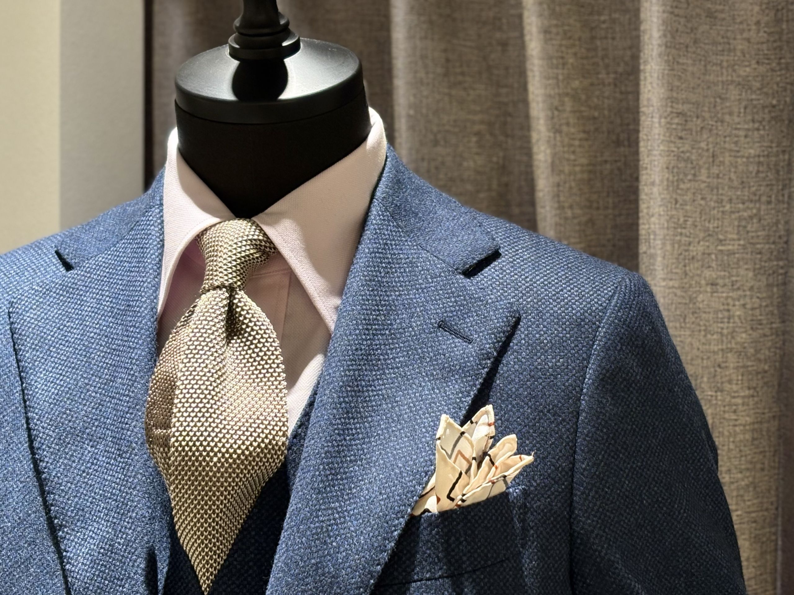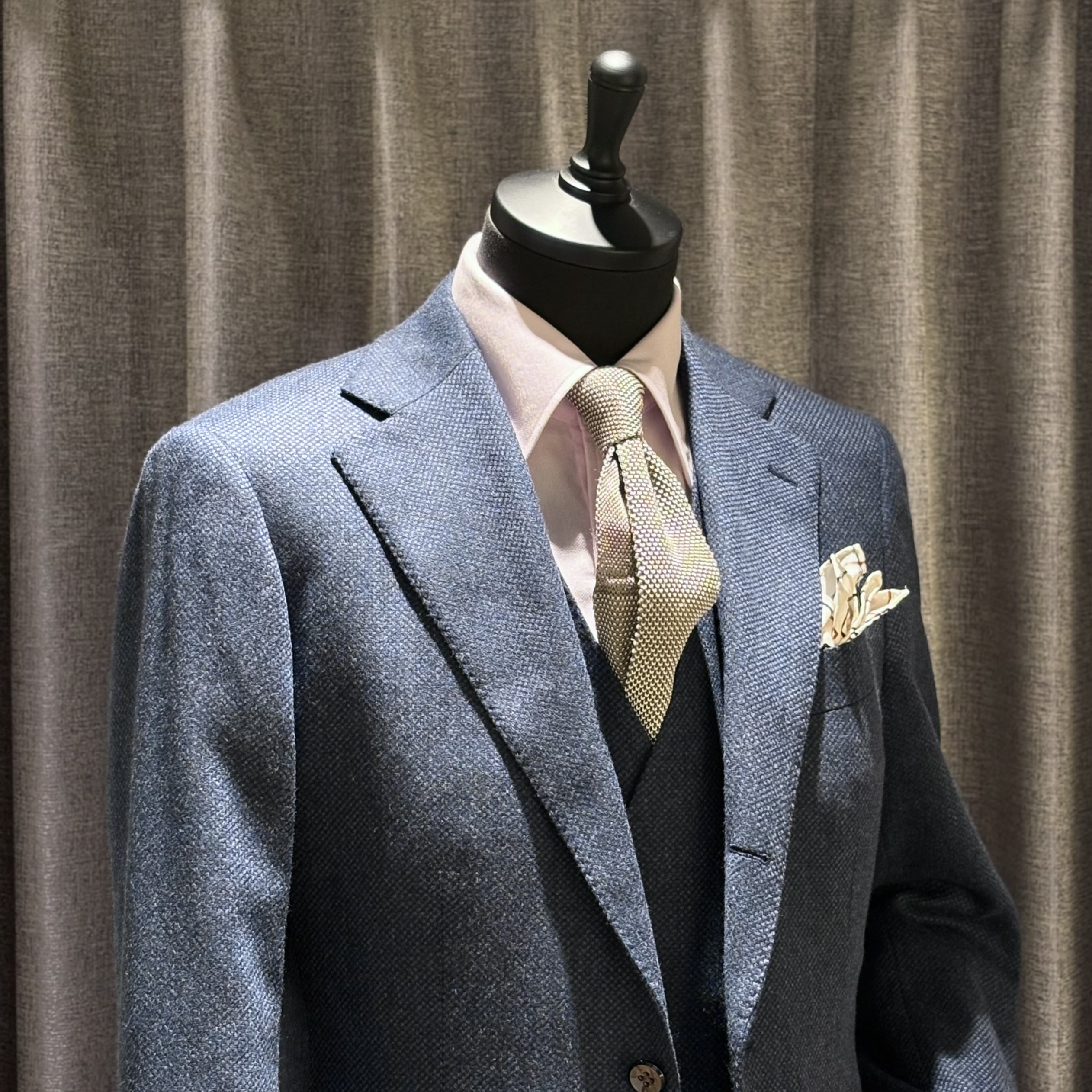 通常のスーツ生地は”梳毛糸”と言われる、毛羽を取り除いた糸で織られた艶のある滑らかなものが多いですが、
