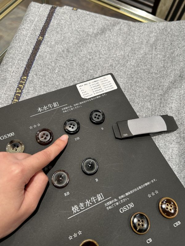 似た色味のグレーの裏地に本水牛のボタンと、できるだけシンプルかつ無難にしました。