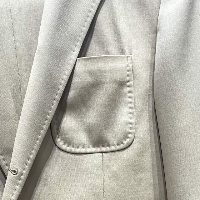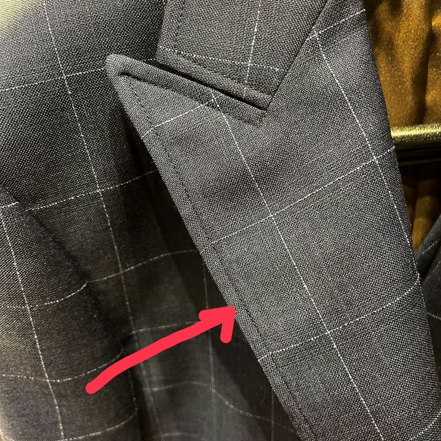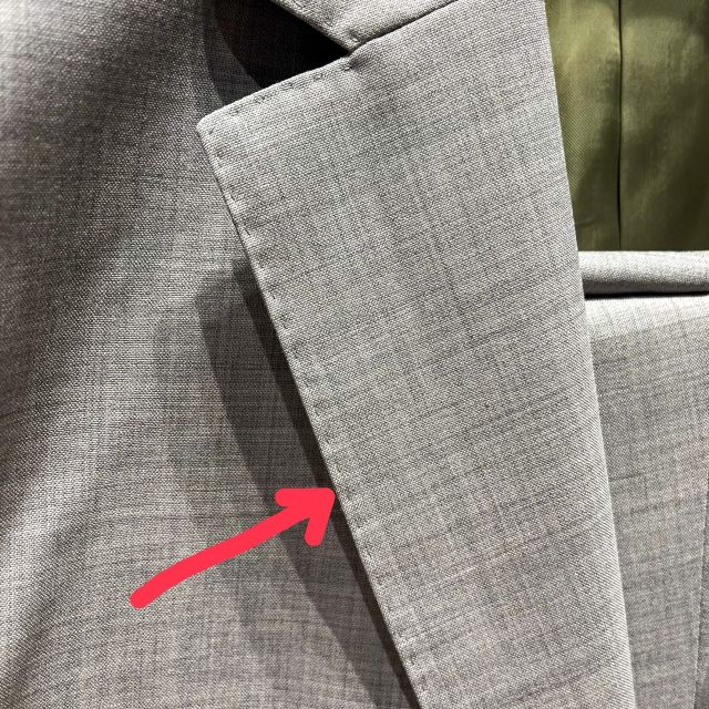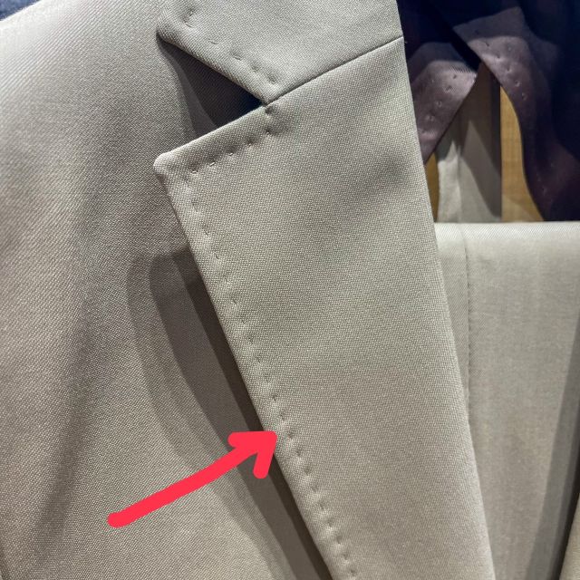 通常のスーツのステッチは、襟の端っこに手縫い風のステッチが付くのですが、