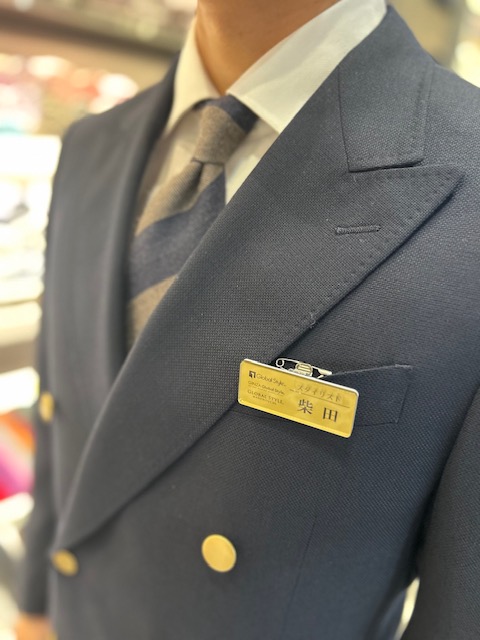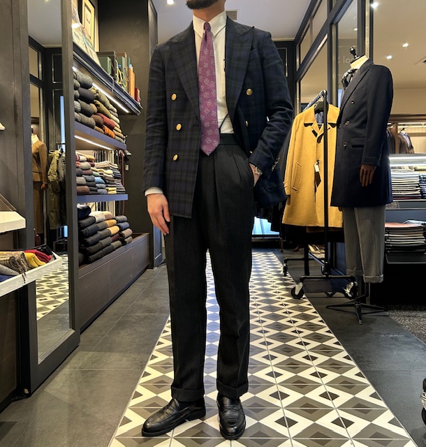 スタッフ柴田はミディアムグレーのスラックスにネイビーのダブルブレスト、、、