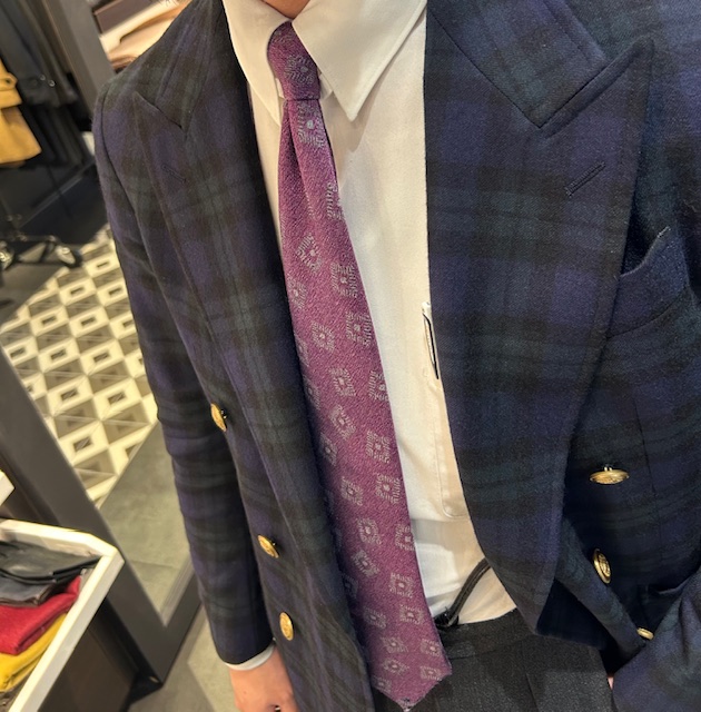 本日はブラックウォッチのダブルブレストのブレザーにチャコールグレーのスラックスを着用しております。