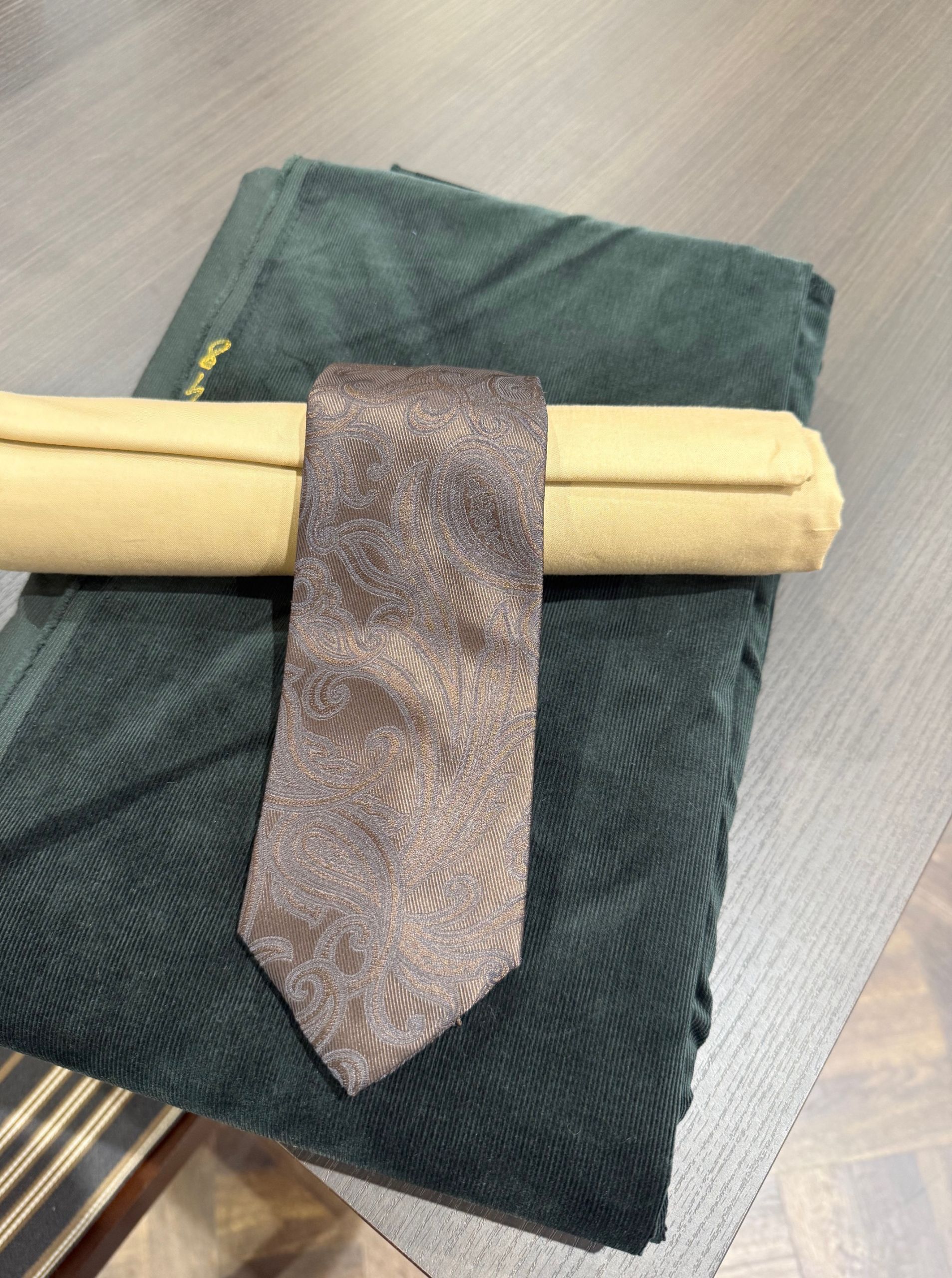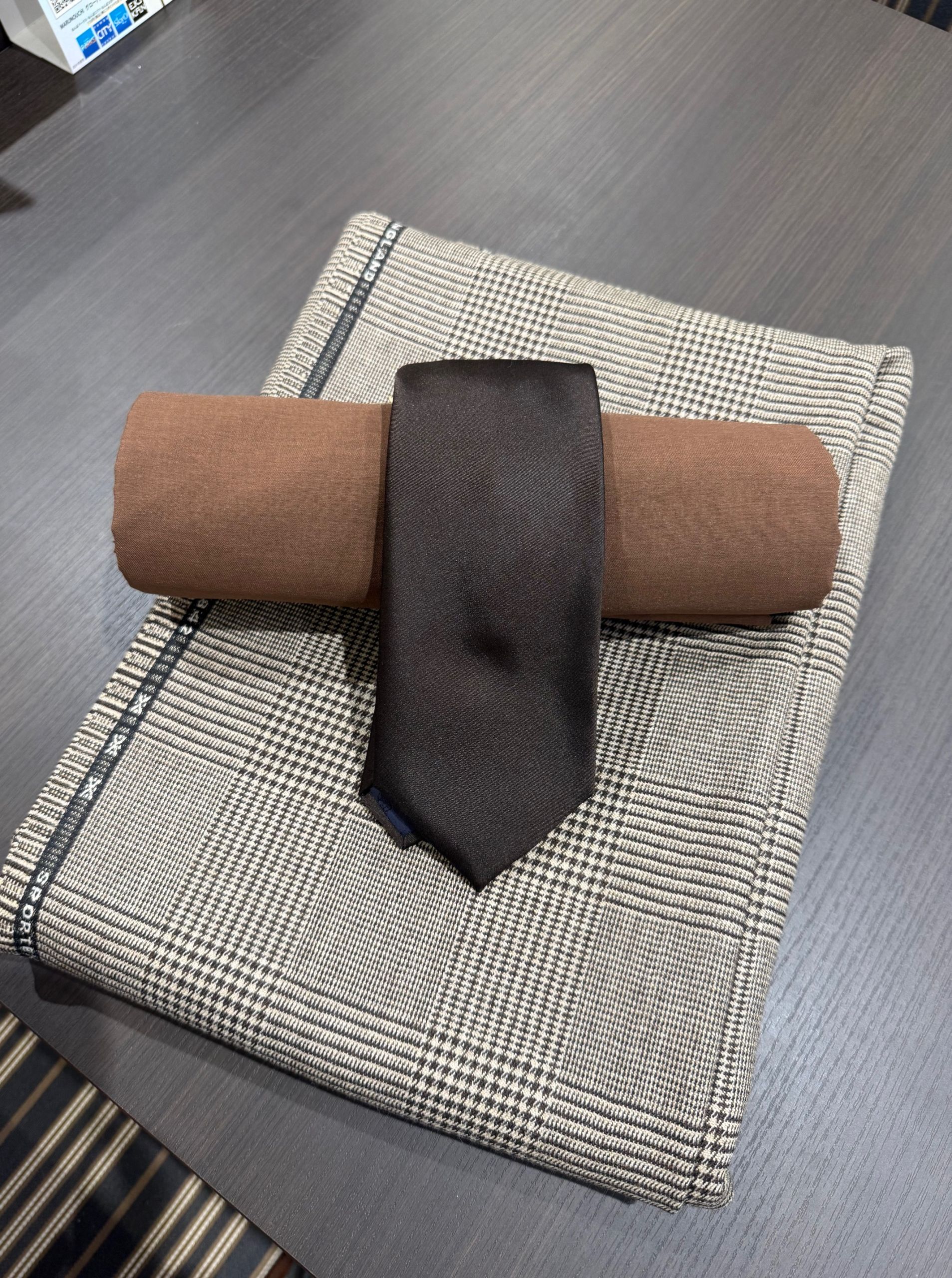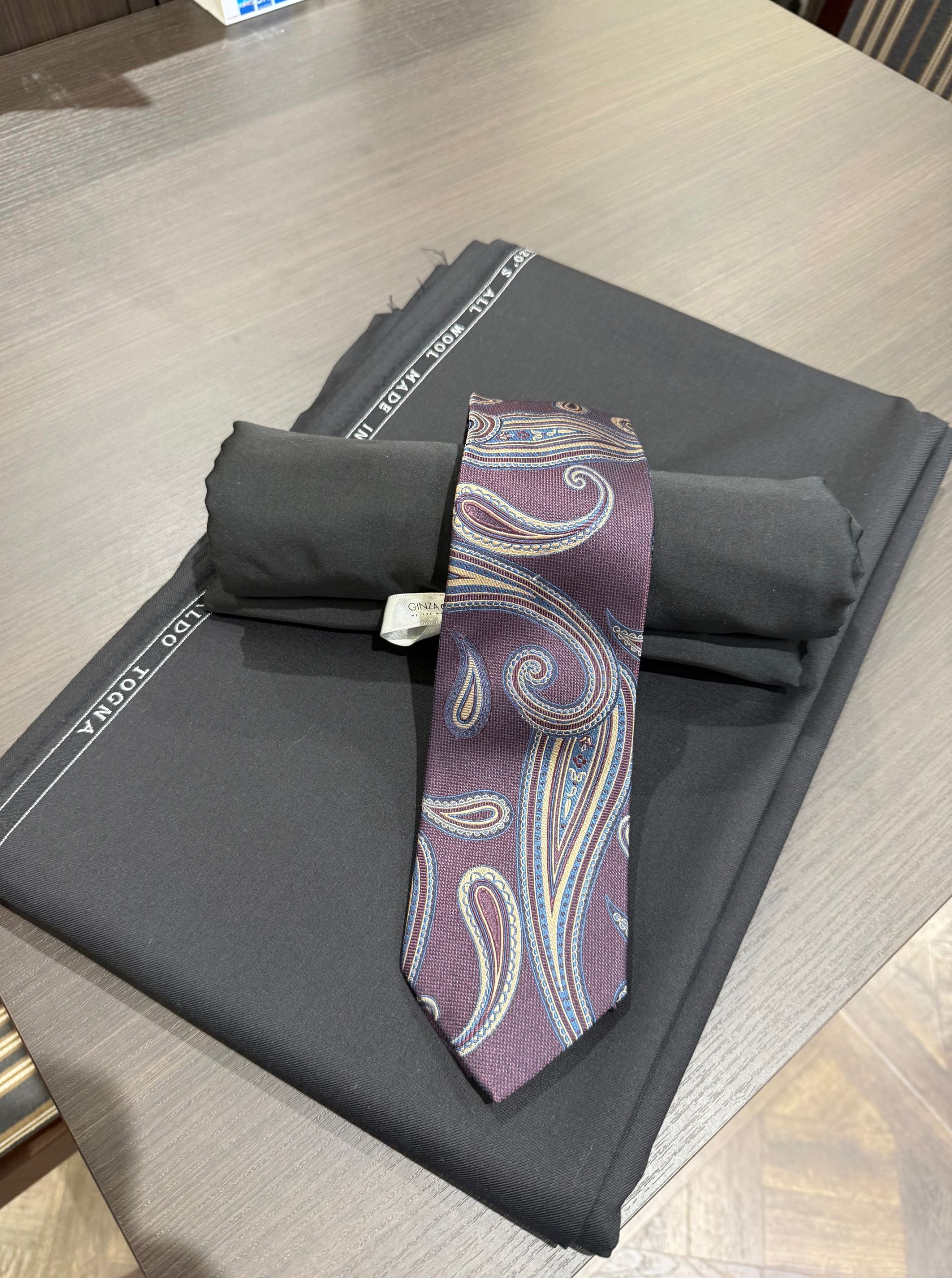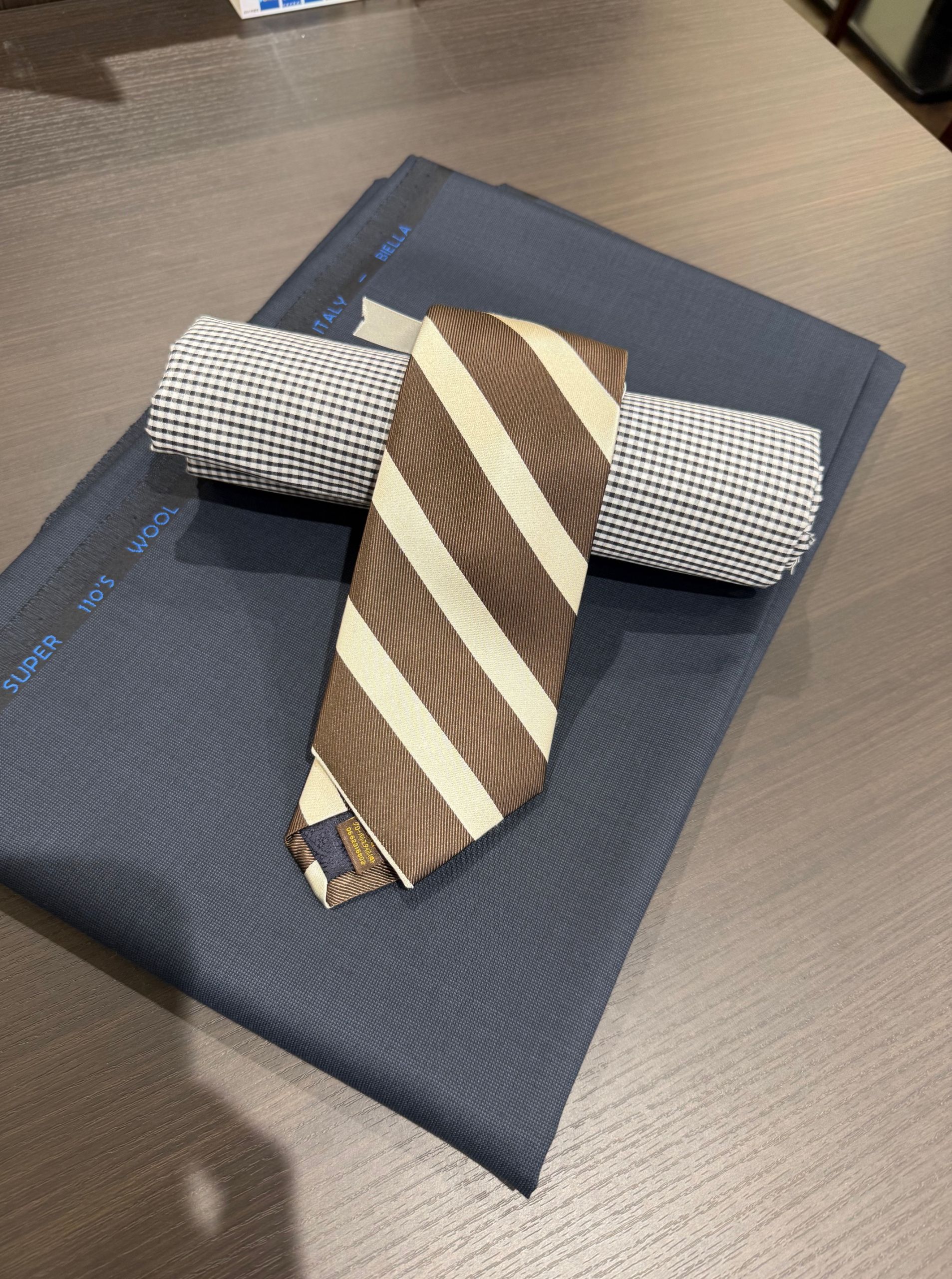 最近はこのようなスーツ生地、シャツ生地、ネクタイのセットが多いです(個人的に)