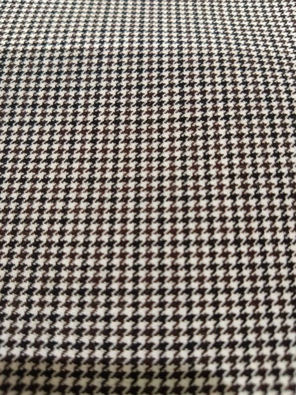 ハウンドトゥースは主に白色と黒色、白色と茶色の組み合わせが多いですが、この生地は白色に黒色と茶色が交互に組み合わされているので遠目で見るとほんのり茶色がかったグレーに見える面白い柄になっています。