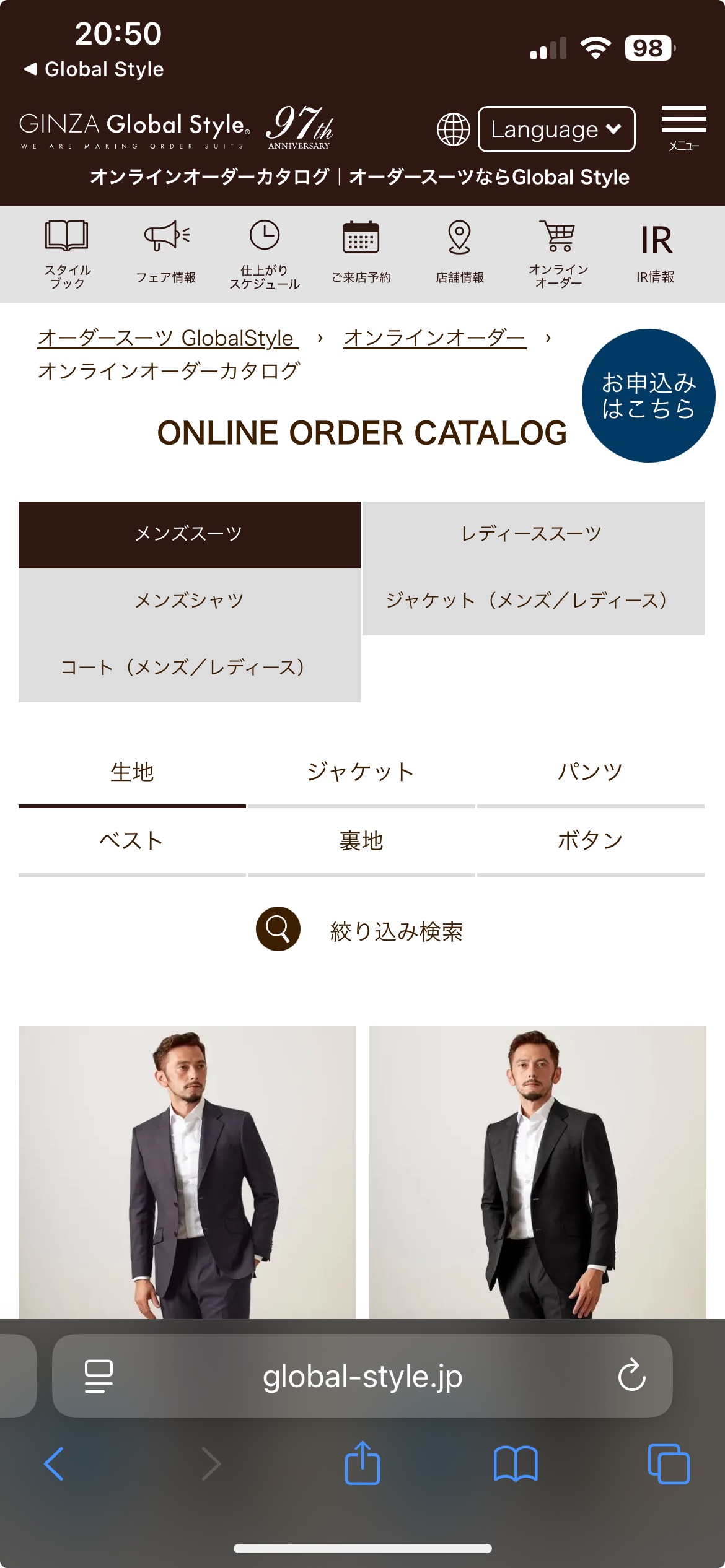 オンラインオーダーではオンラインカタログから生地をお選び頂きますが、