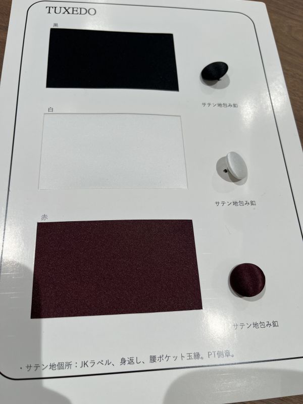 タキシードには生地と統一感を持たせるためにサテンボタンと合わせます。