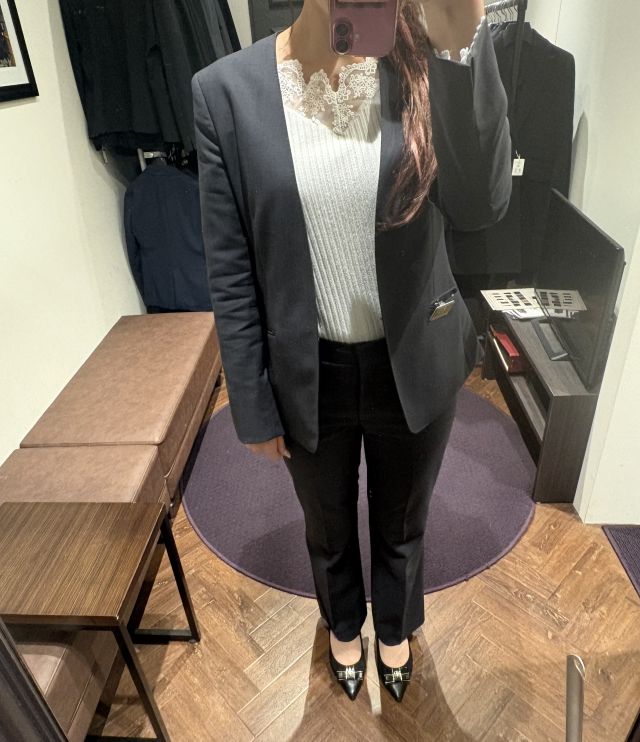 チャコールグレーのノーカラースーツが仕上がりました❀