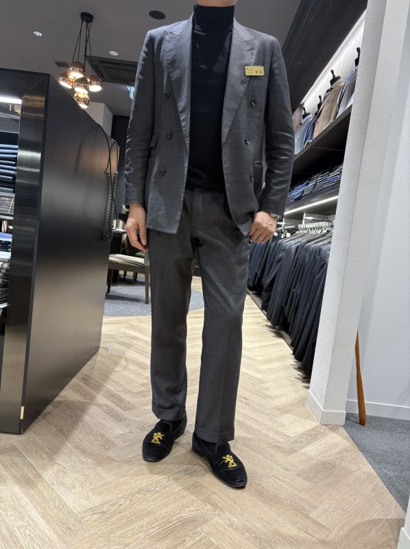 今年の傾向はダブルのスーツを作る方が増えている感じがするので今回はメンズレディースのスタッフのダブルサンプルをご紹介。