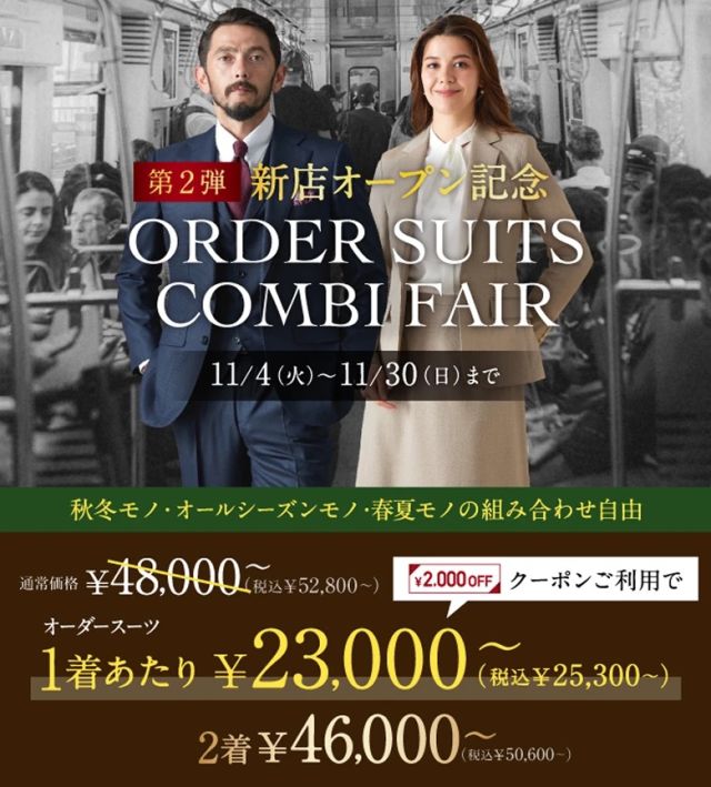 今月もスーツ2着以上注文頂くと1着1000円OFFのクーポンが利用できて