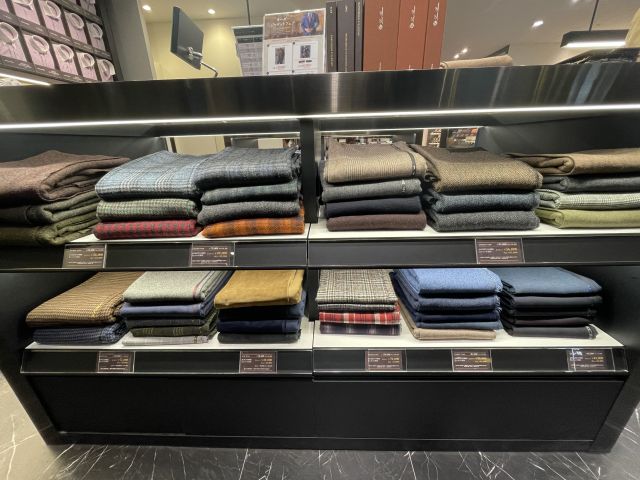 お店入口に飾られてあるマネキンの下に置いてある生地が実際の物になります。