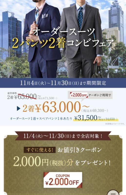 今の期間はスーツ二着ご注文で総額から2000円お値引きもあります。