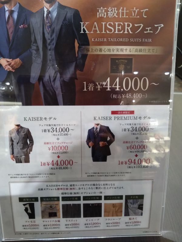 また、通常カイザーモデルは+20000円アップチャージがかかるところ、一部工場に在庫がある生地であればその半額の10000円のアップチャージでお仕立ていただくことが可能でございます。