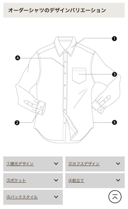 オーダーシャツは下の①〜⑤をカスタマイズできます。