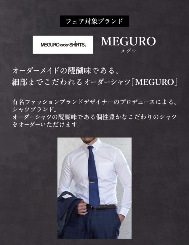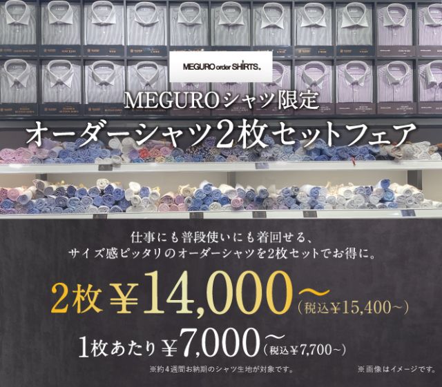 実は最近、新たにメグロシャツ限定で、2枚セットで1枚あたり7,000円〜でご購入いただけるフェアが始まりました。(今までは2枚セットだと最安値8,300円〜)