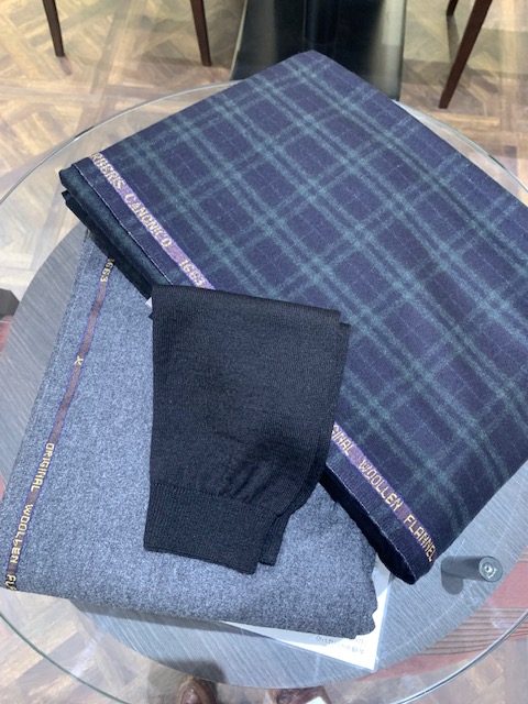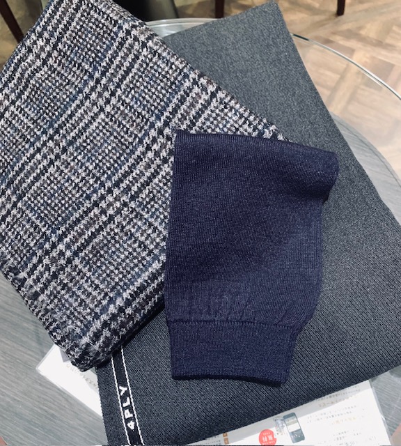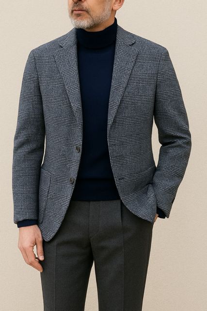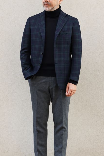 ネイビーにグリーンのウィンドウペンがポイントのジャケットに