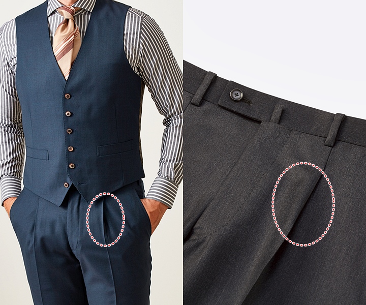 このタックがあることによって、スラックスにゆとりが得られるため、立ったり座ったりする時に足回りが突っ張りにくくなるメリットがあります。