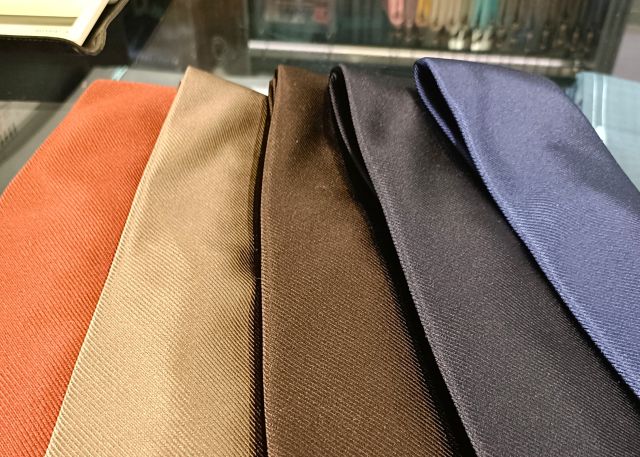 今回様々な無地ネクタイが入荷しましたが、個人的におすすめの5色の無地ネクタイについて、それぞれの特徴とおすすめの着用シーンをご紹介します。