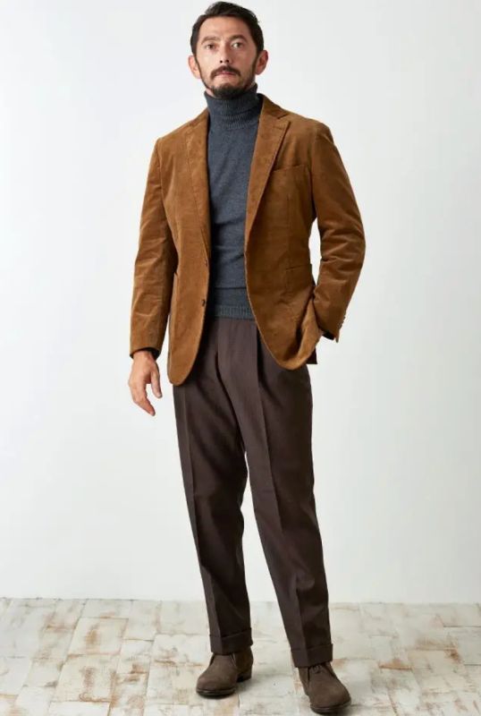 品のあるコーデュロイ×ブラウンのスタイルで、秋冬シーズンの生地になります。肩パットや芯地を極力排したアンコンモデルでジャケットを仕立てました。インナーにはニット、ジャケットとは彩度の変えたブラウンのボトムスを合わせてプライベートでもカッチリしすぎない大人の着こなしを楽しめます。