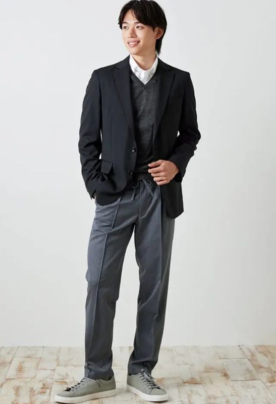 定番な無地のブラックで、オールシーズン着用していただけます。肩パットや芯地を極力排したアンコンモデルでジャケットを仕立てました。スニーカーを合わせて軽快さをプラス。シンプルなコーディネートながら年齢に関係なくビジネスカジュアルからプライベートまで幅広くお使いいただけます。