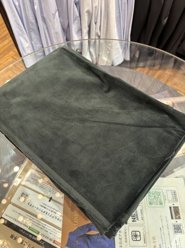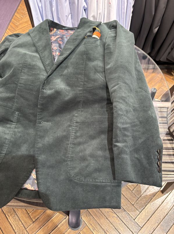 色柄がダークグリーンで、生地の特徴としてはコーデュロイ生地なんですがストレッチ性がある生地なので、