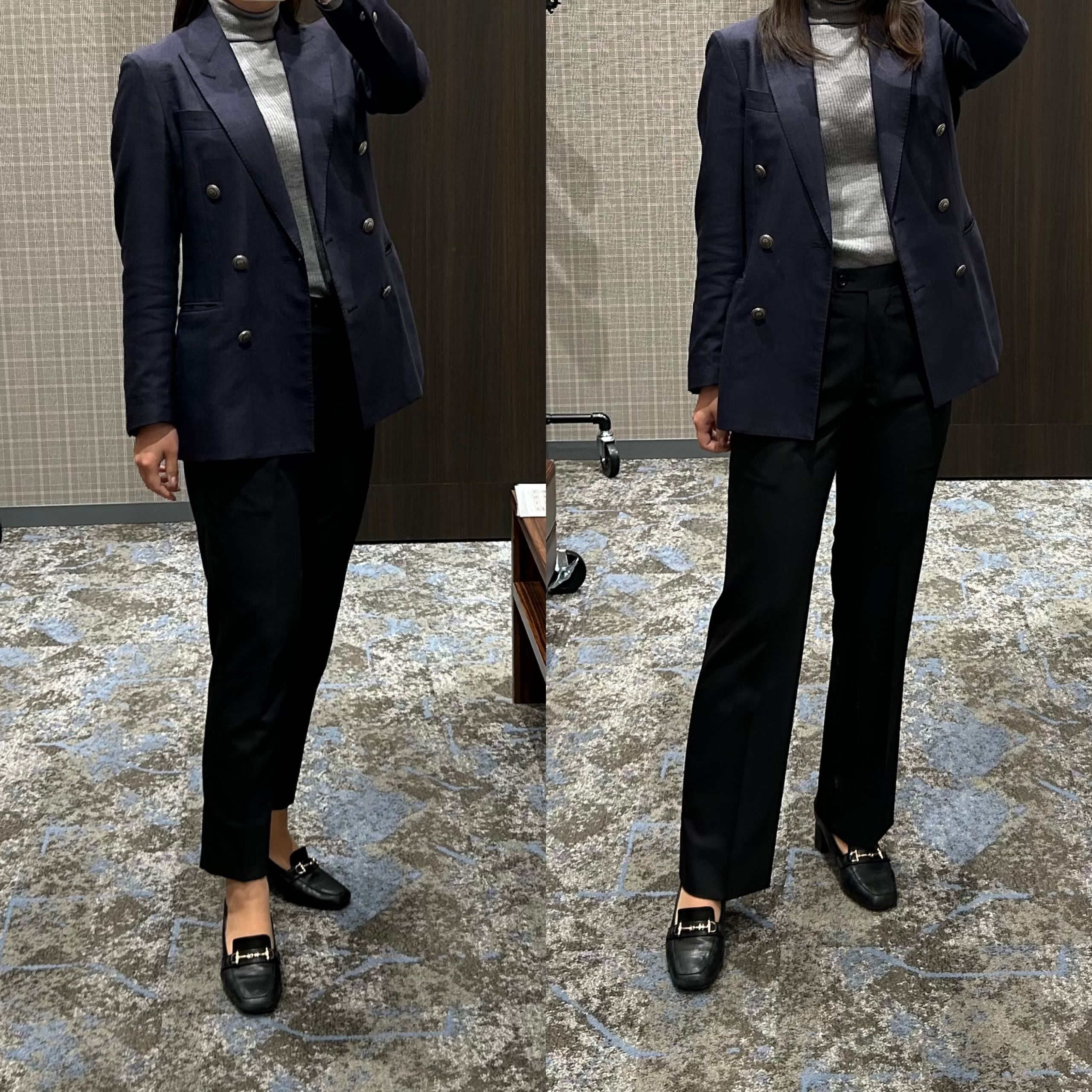 同じ生地でも、テーパードパンツ(左)とセミフレアパンツ(右)でこんなに違います!