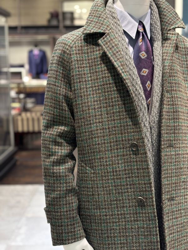 こちらはハリスツイードの生地で仕立てたバルカラーコート。