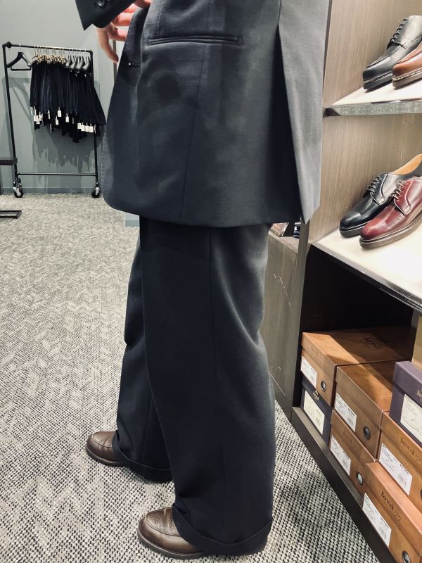 スラックスを太くしたのでバランスを見てジャケットの着丈も長めに変更しました。