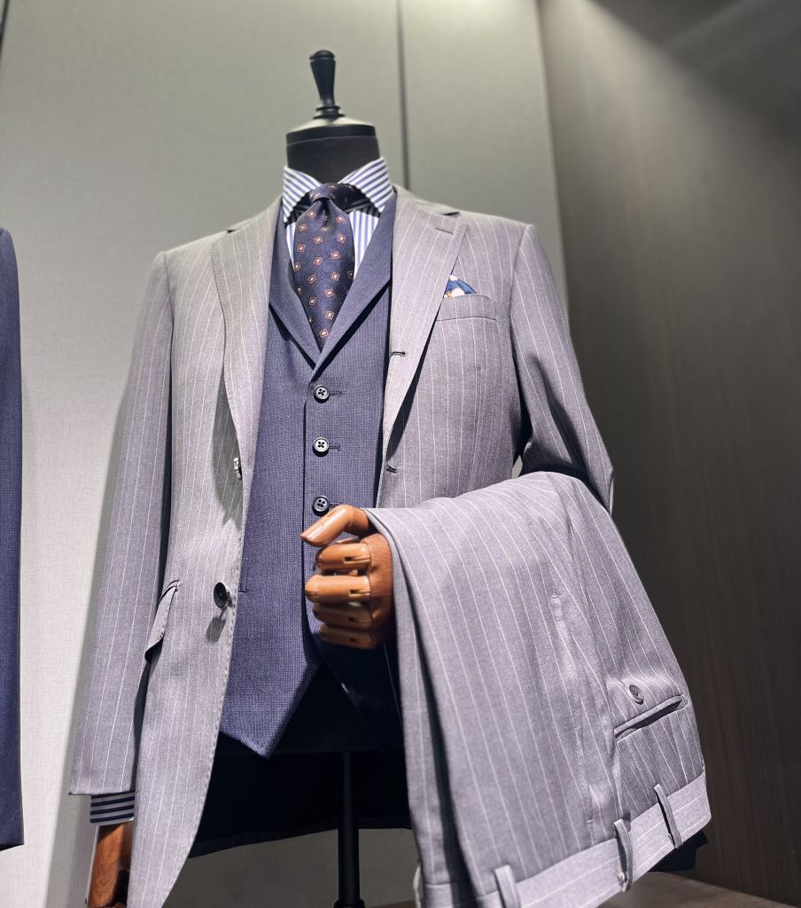 まず1つ目は、ジャケット・パンツとセットになっていないベスト(オッドベスト)を着用している点です。少し上級者の着こなしにはなりますが、この写真のようにネイビーとグレーの相性はいいのでチャレンジしやすいと思います。
