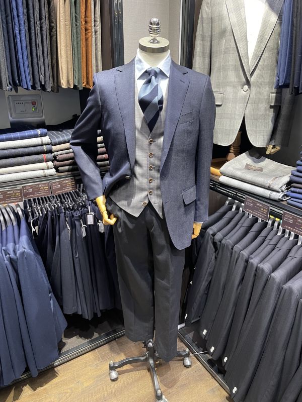 通常の三揃いは同生地で揃えるのがスタンダードですが、オーダーならではの楽しみは“ベストだけを別生地にして遊べること”。
