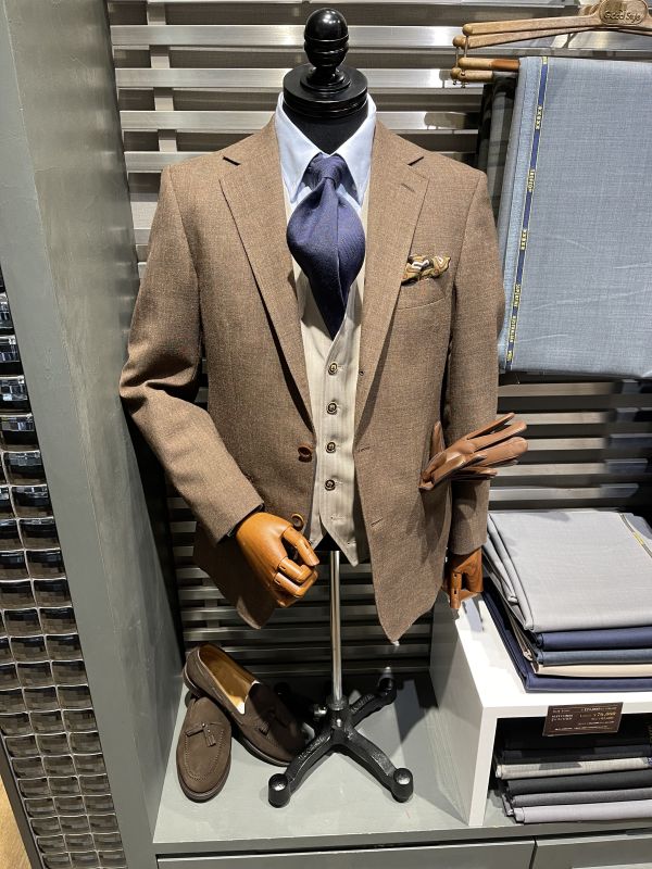 今回は“オーダー三揃いならでは”の楽しみ方を気軽に味わえる、ベストだけをワンポイントで華やかに仕立てたカジュアル寄りのスタイルをご紹介します。