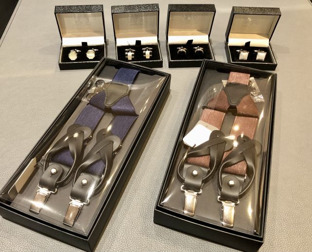 最近はあまりみかけなくなりつつあるサスペンダーやカフスボタン入荷しております!