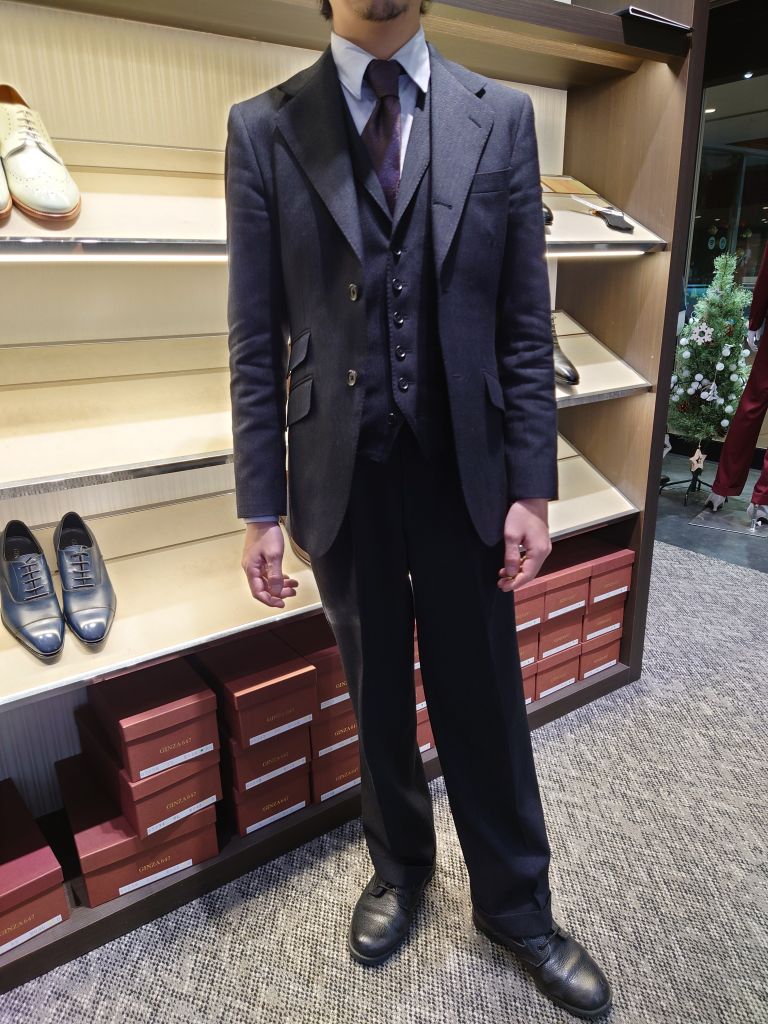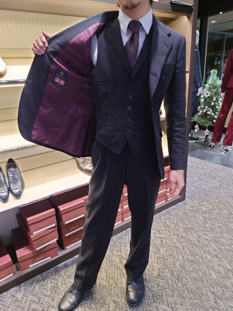 ベスト付きのスリーピースはおまとめ買い価格で税込¥95,150‐でお仕立て出来ます。