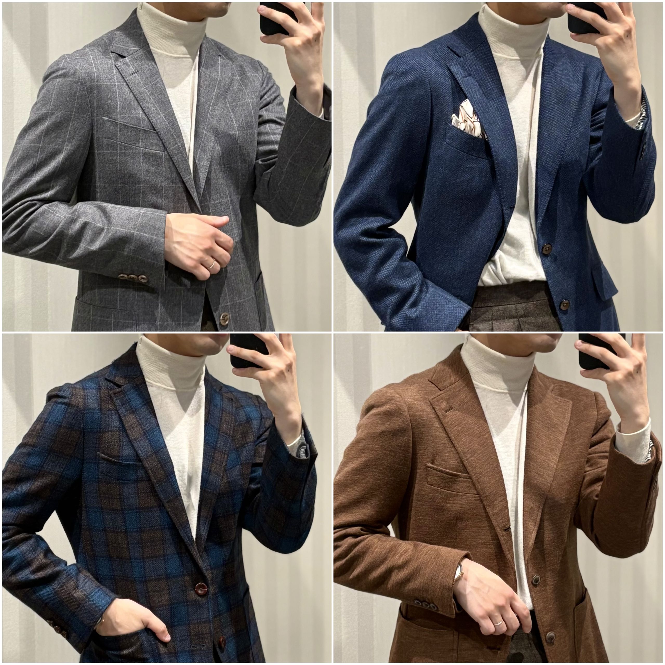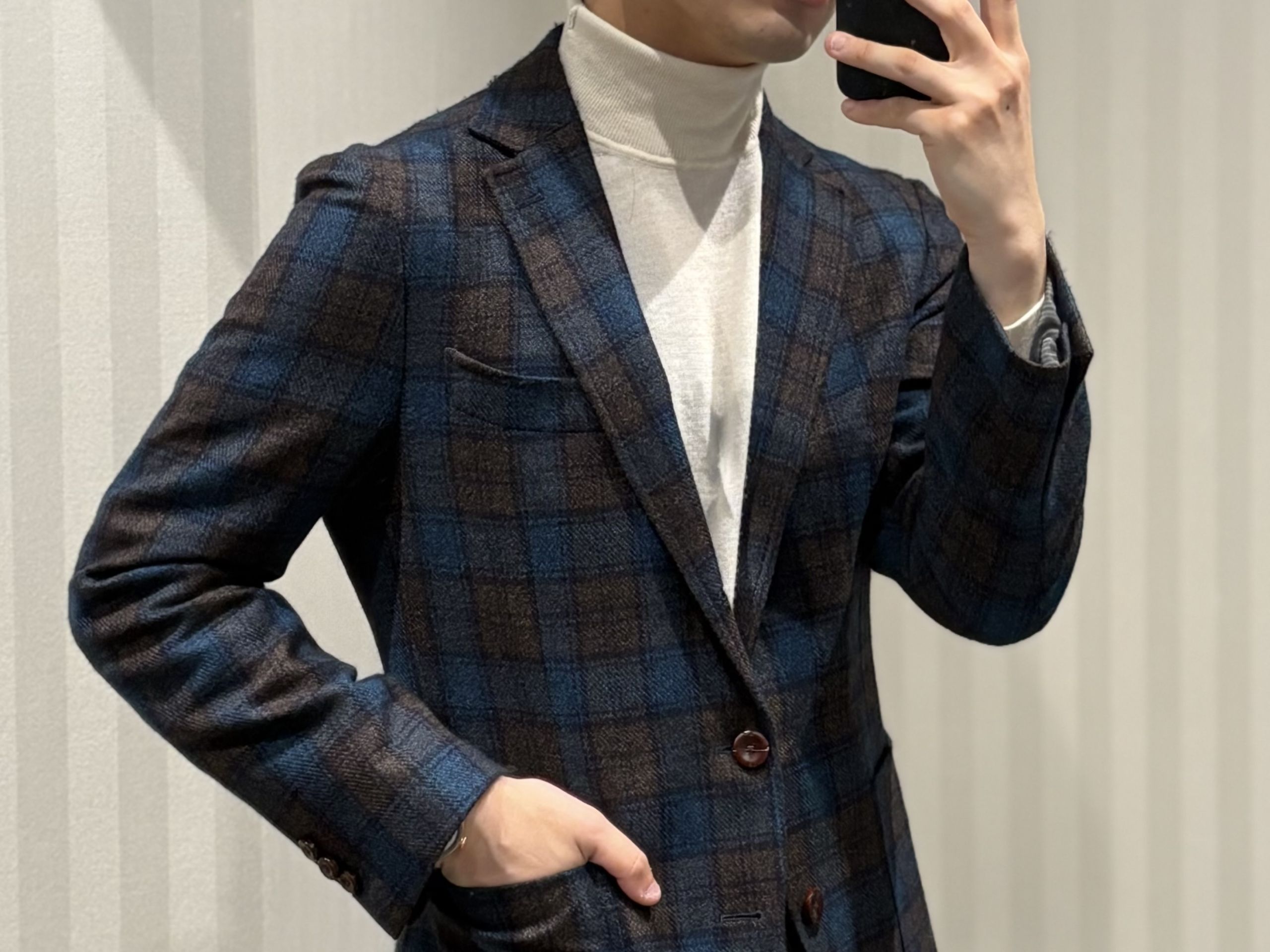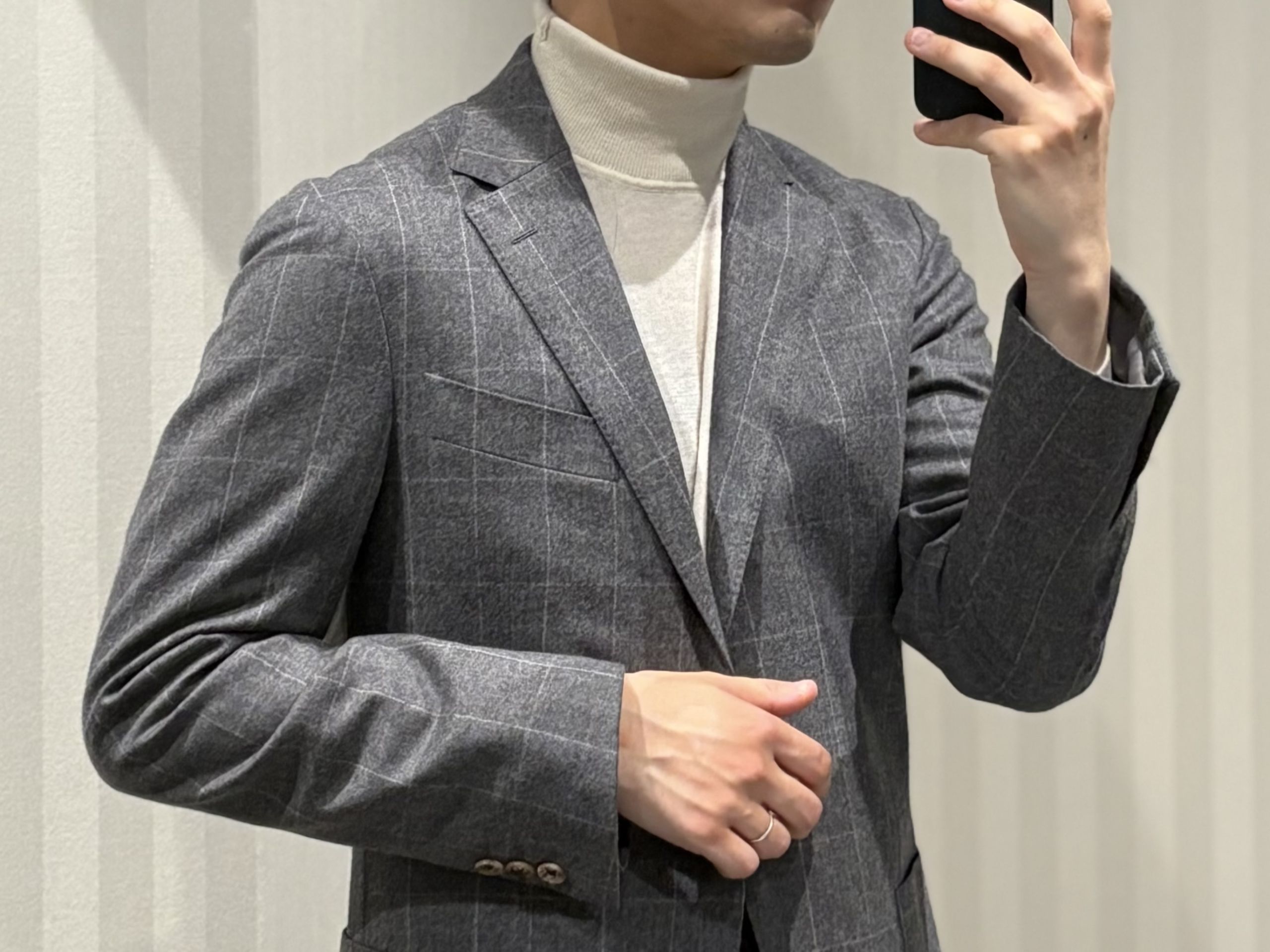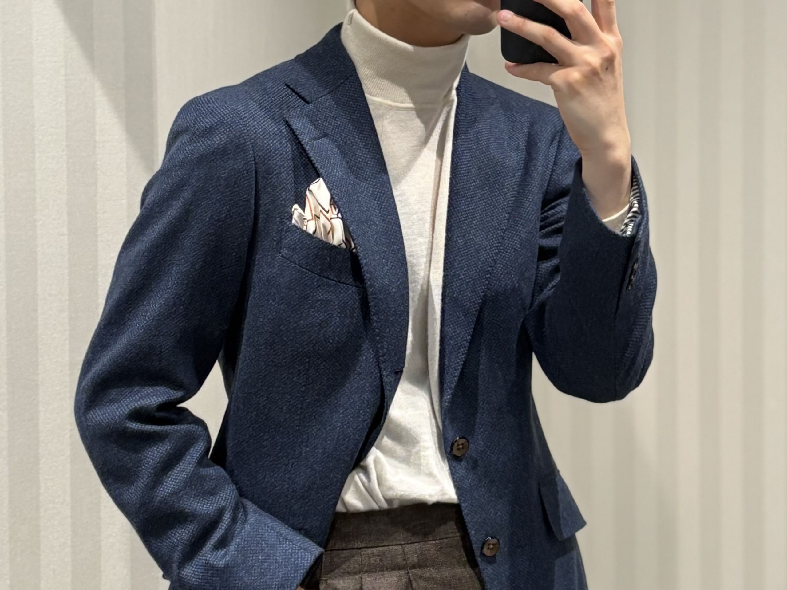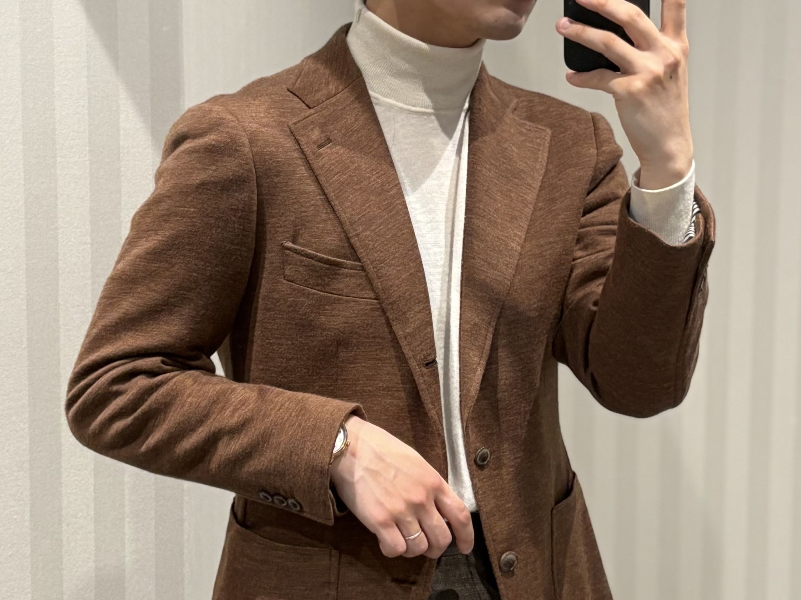 先日白のハイネックニットで出勤していたので、試しにお店のサンプルジャケットを着てみたところ、、、