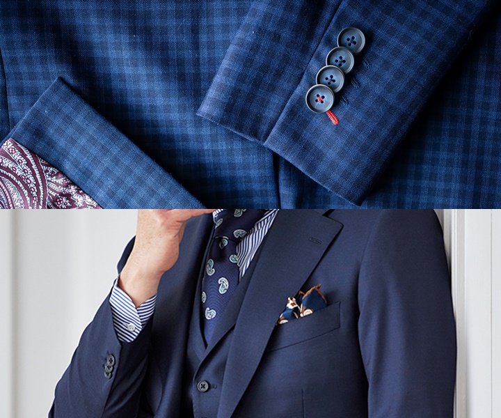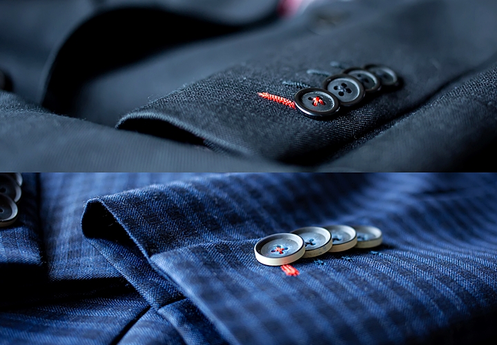 主に袖の釦ホールと、スーツの襟にあるフラワーホールのカラーを変えてアクセントにできます。
