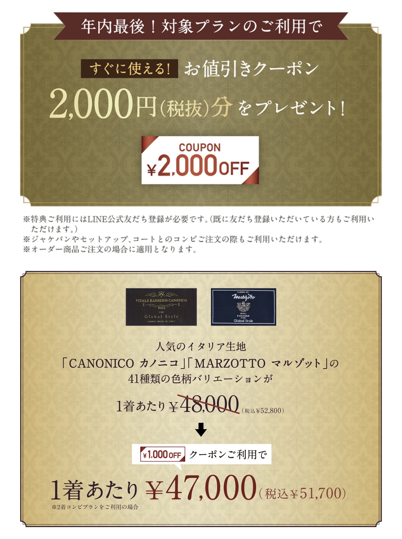 ■オーダースーツをお買い上げの方に、2時間分サービス券 をお渡しいたします。