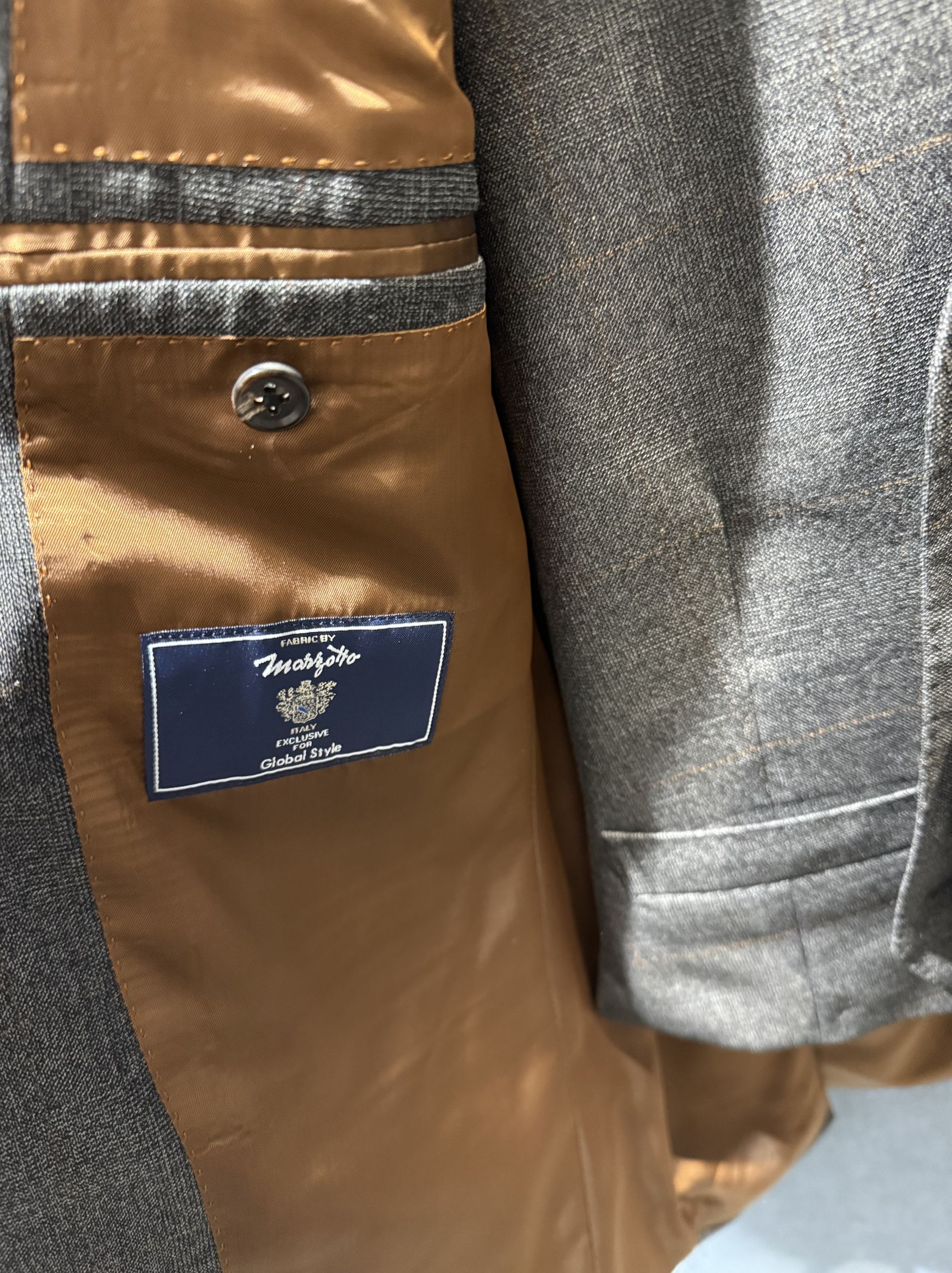マルゾットのグレーチェック地で仕立てた、3ピーススーツでございます。