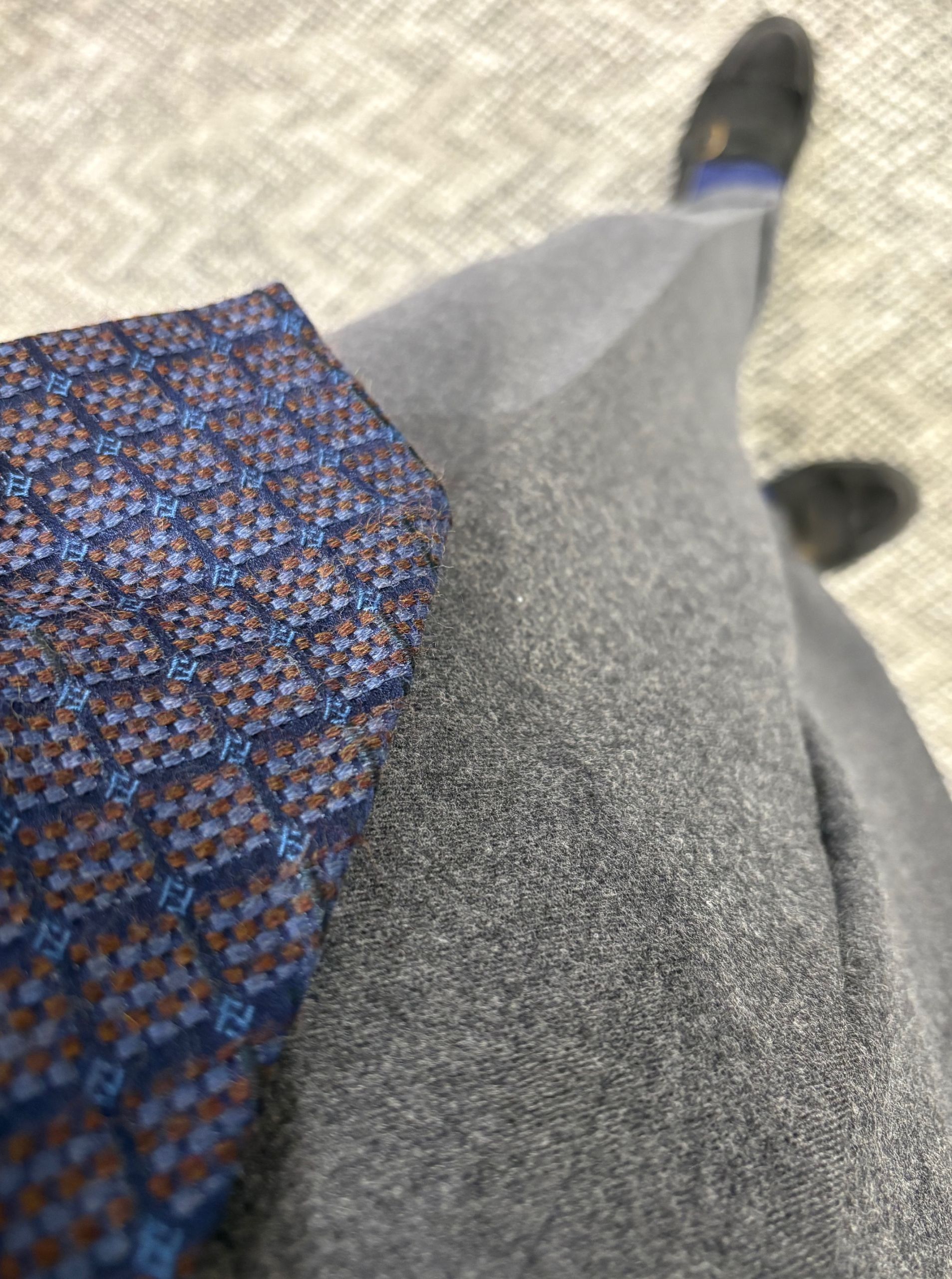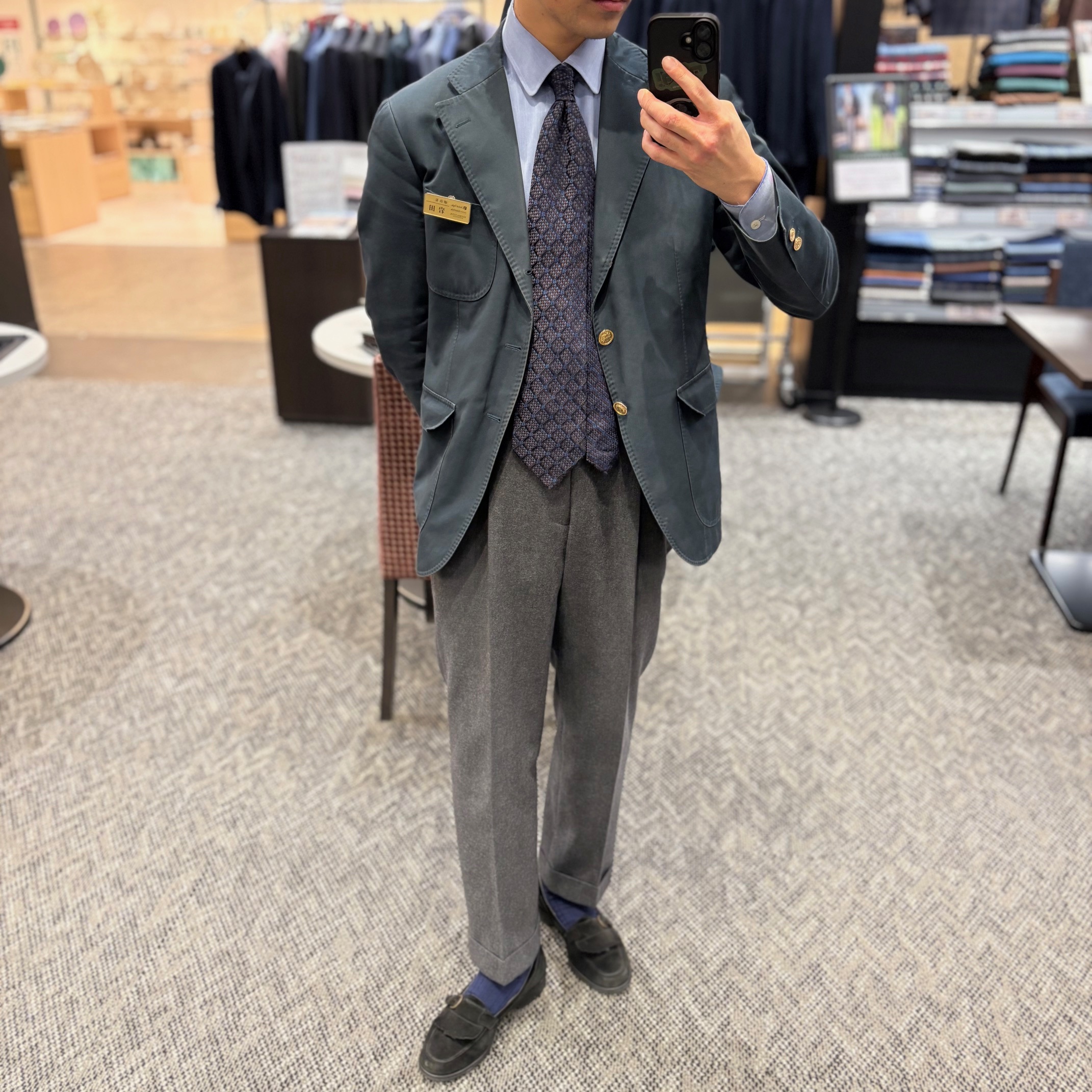 本日はブレザー×グレースラックスの定番スタイルで出勤しております!