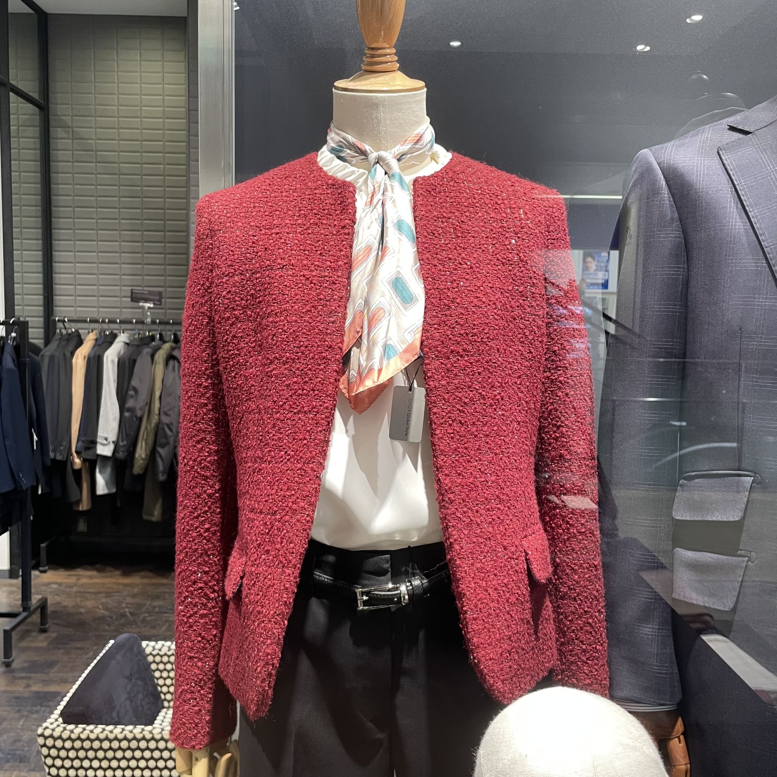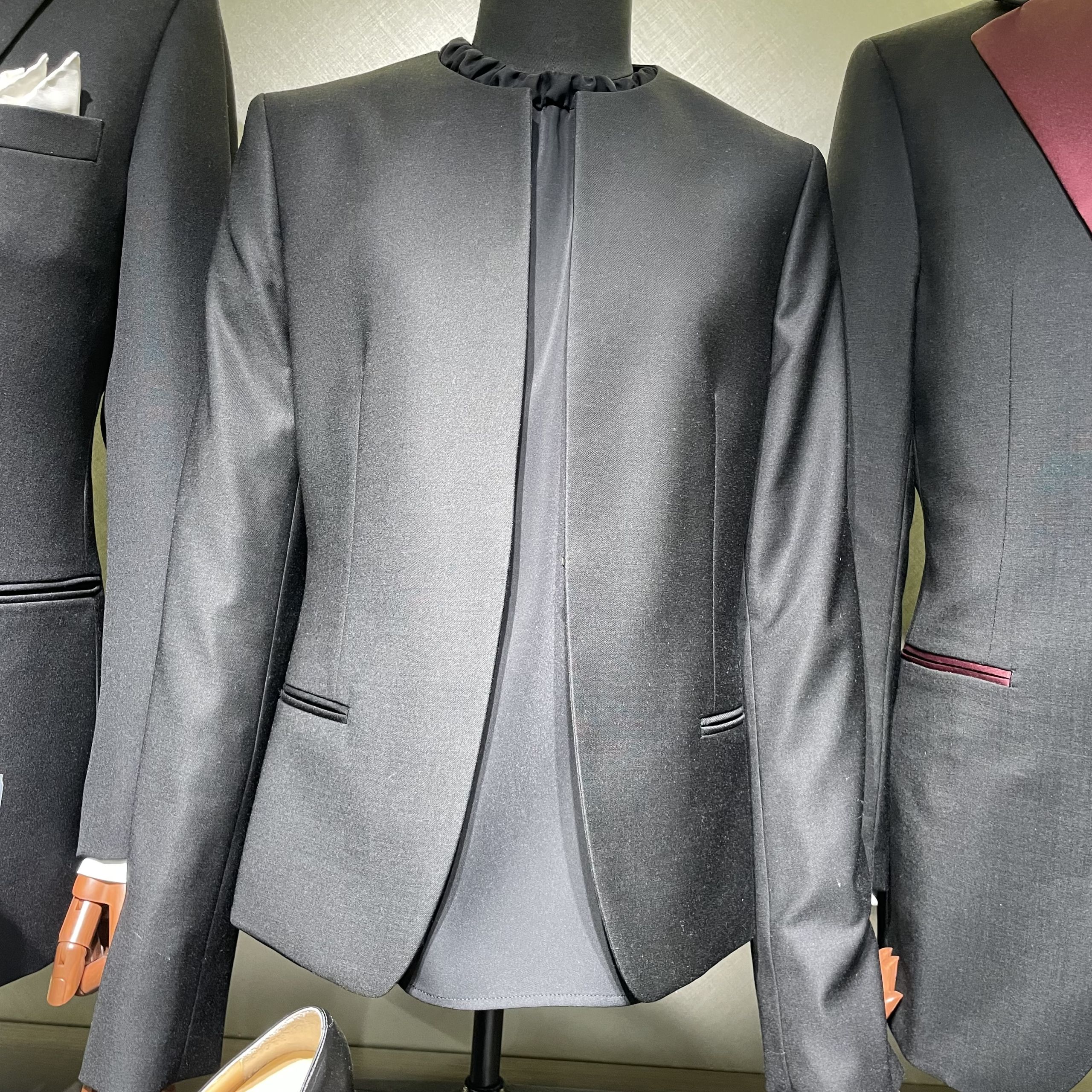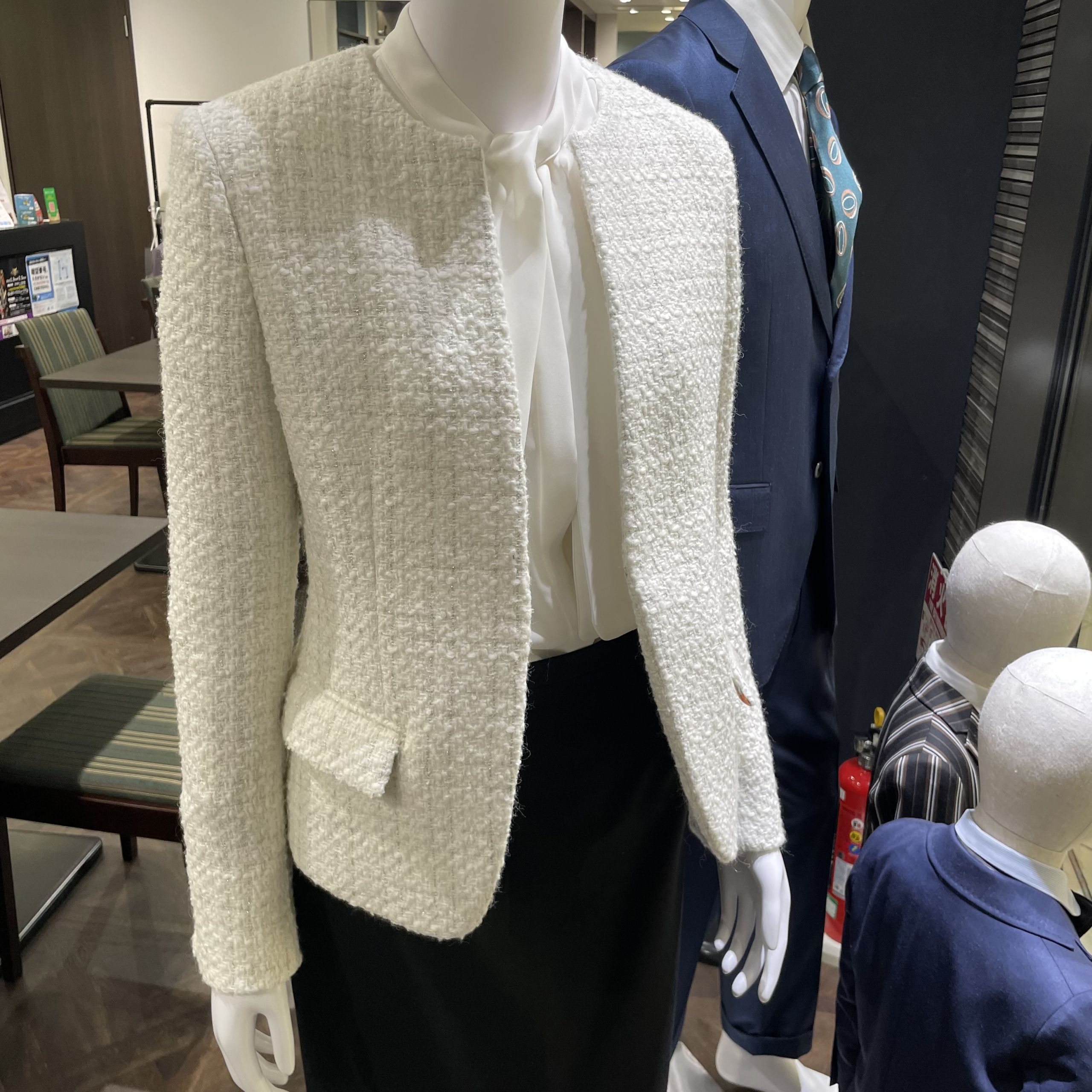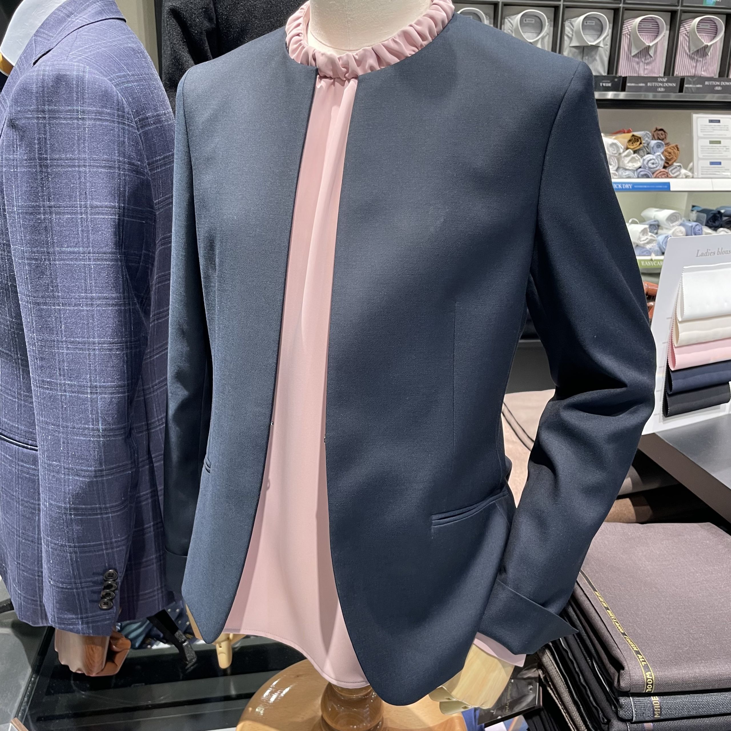 ノーカラーとは また違ったデザインで襟元が詰まっているので 上品な雰囲気がでますね!!