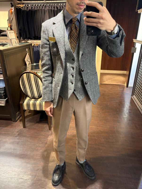 本日の私のスタイルはジャケットとベストがハリスツイードのジャケパンスタイル。